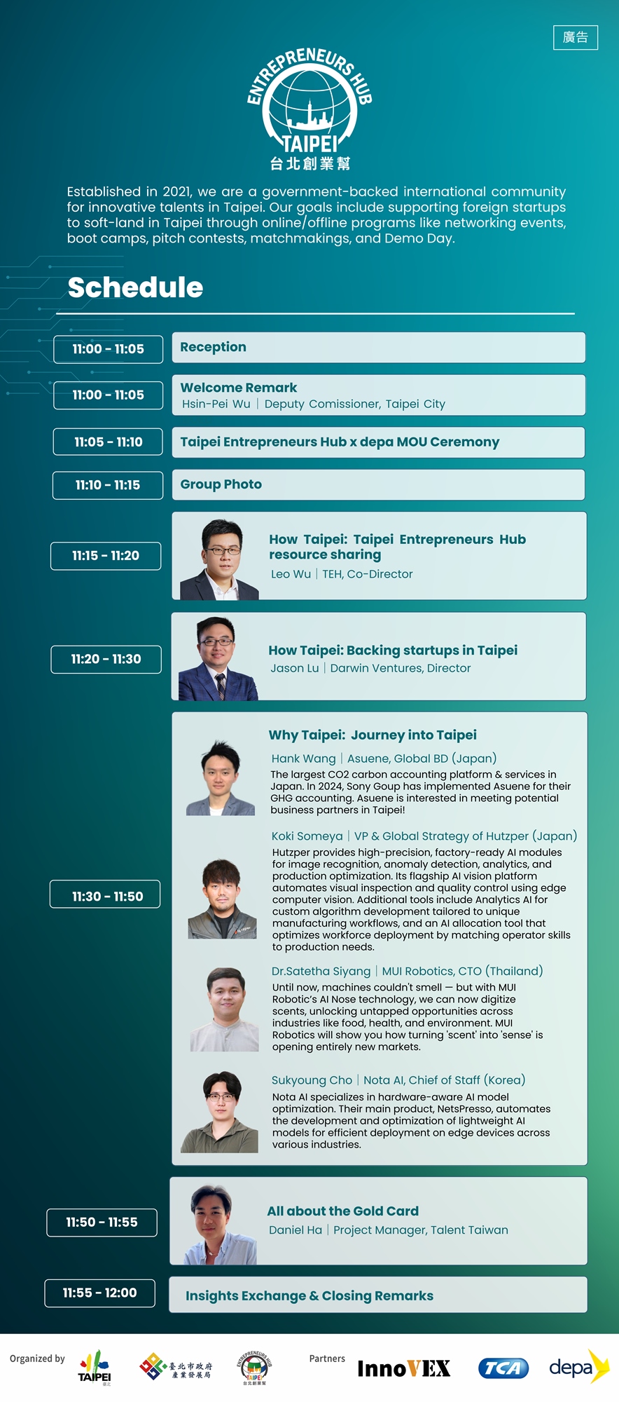 🙌 WHY Taipei – Hear from AI and ESG startups from Japan, Korea and Thailand as they share firsthand experiences on why they chose Taipei as their next stop! Discover the city’s strong support for innovation and grow your venture in one of Asia’s most founder friendly city!Meet face to face and gain exclusive insights from: