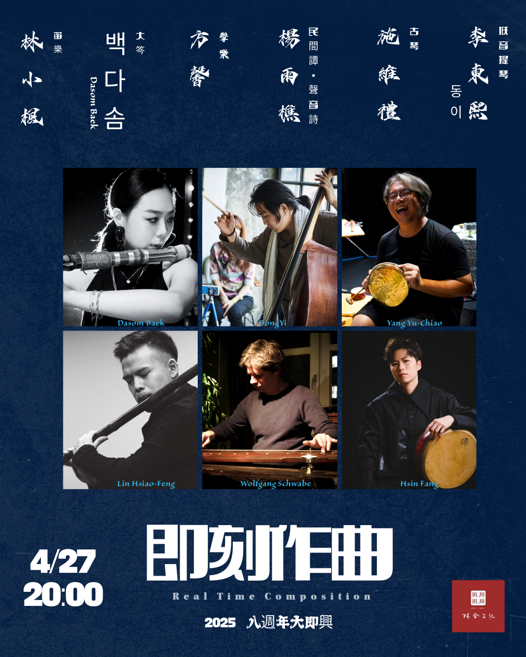 演出邀請來自韓國的大笒演奏家백 다 솜 (Dasom Baek)、近年旅居台北的屢獲音樂大獎的韓國低音提琴演奏家李東熙동이、德國演奏古琴的漢學家施維禮Schwabe,Wolfgang、首度作客林舍文化的民間譚表演藝術家楊雨樵、台灣當代跨域擊樂家方馨、林舍文化笛樂林小楓,聯手共襄盛會,難得的大即興演出,歡迎朋友們蒞臨參加!