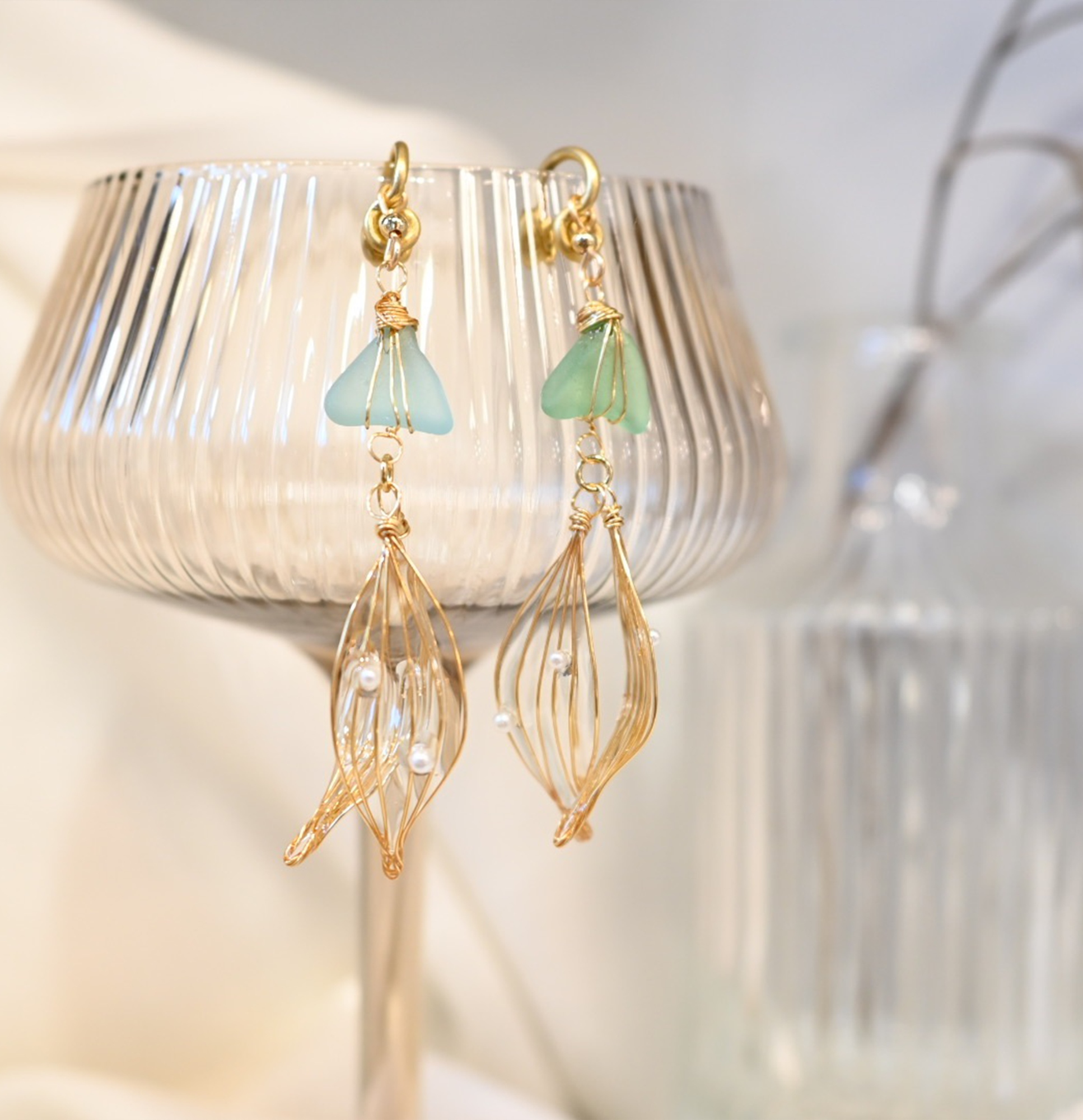 |活動內容|將海玻璃用不打洞的方式,利用藝術銅線纏繞,UV 粘膠創作出美人魚尾巴,一個活動一次學兩樣創作!可以耳夾或耳針。