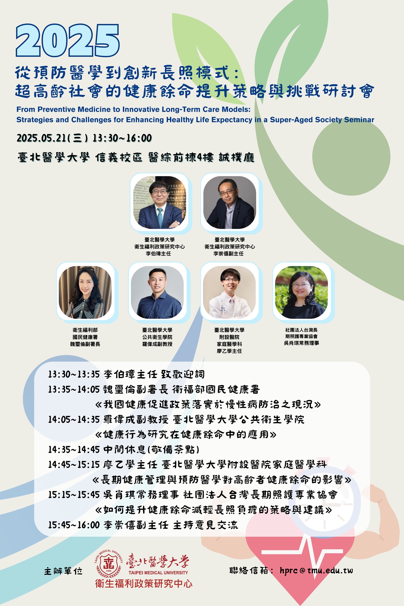 本次研討會將以「從預防醫學到創新長照模式:超高齡社會的健康餘命提升策略與挑戰」為主題,從政策支持、臨床實務、學術應用以及民間資源整合等四個層面,深入探討如何有效減少不健康餘命並延長健康餘命的具體策略,以迎接超高齡社會的挑戰。