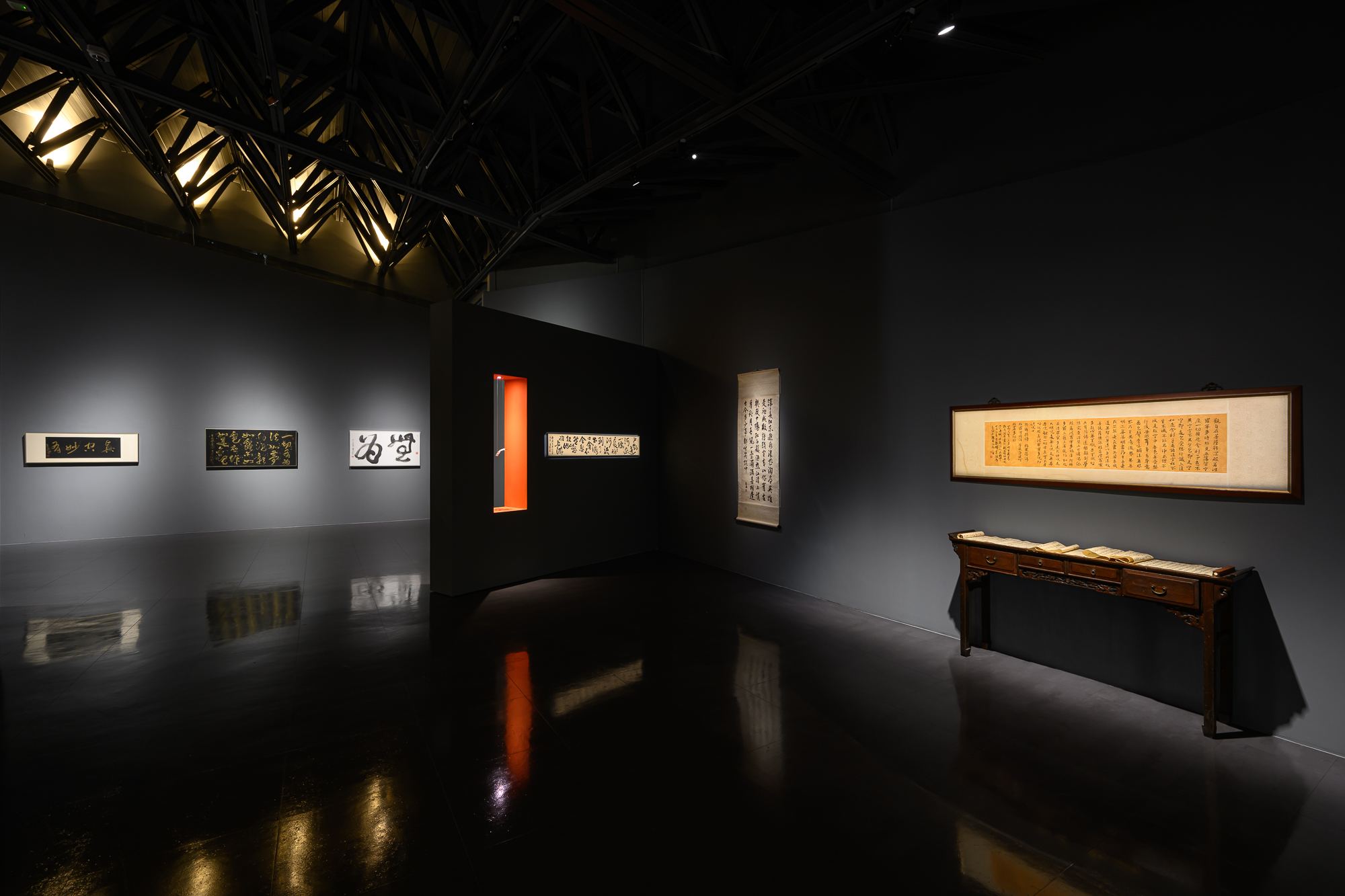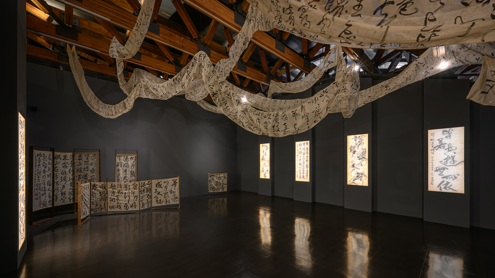 展區靈感來自藝術家未展出書法作品,展現創作過程的探索與突破。U型展廳內部呈現經典《道德經》長卷,外部以鏡面反射,延伸無限想像,呼應展覽主題「當下」。本展區不但呈現藝術家的反思與挑戰,亦提供觀眾特殊的觀展氛圍與沉浸式的體驗。