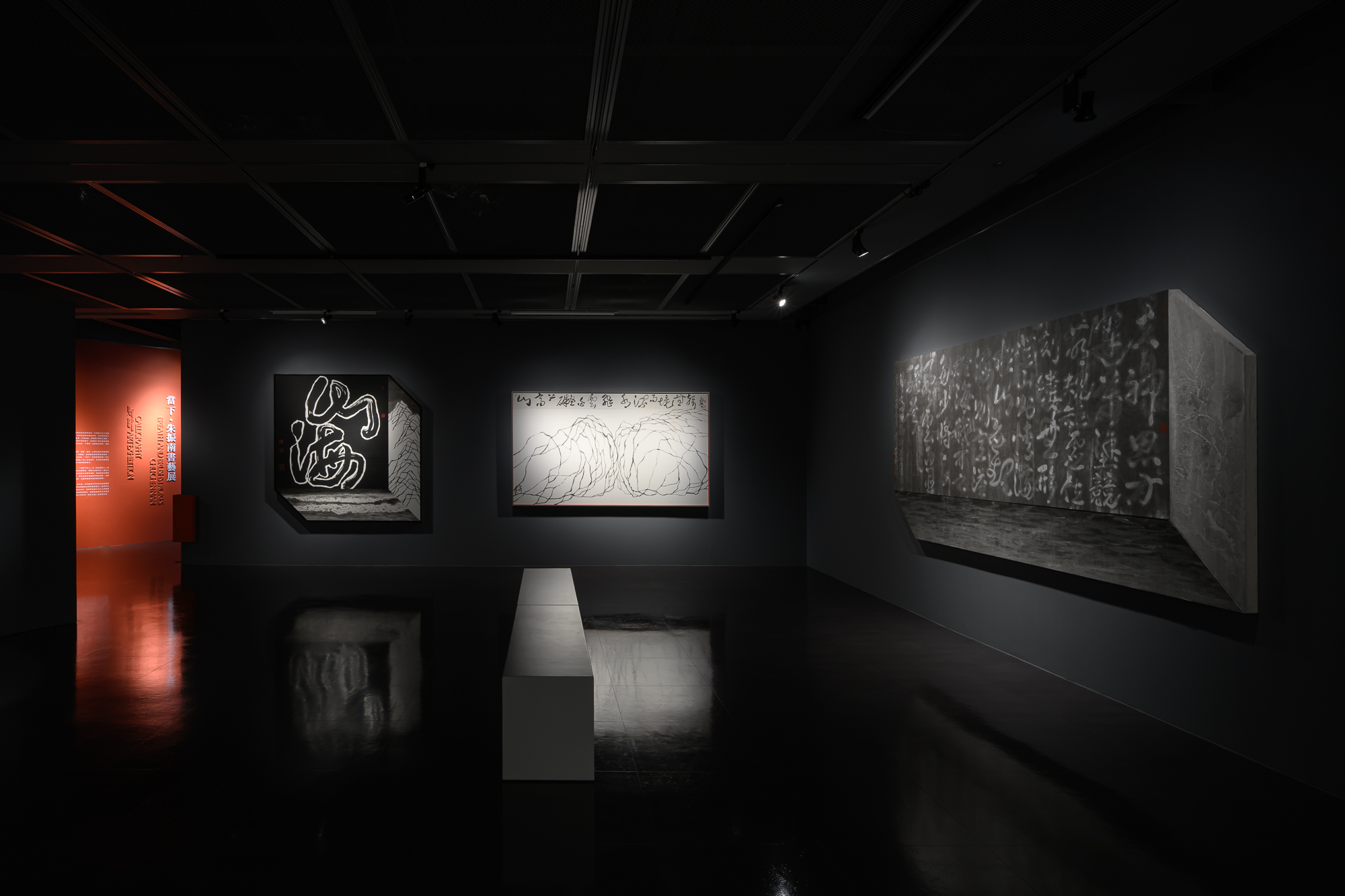 在凝聚了六十多年創作經歷,從印刷廠學徒到國際舞台,朱振南的書法已成為生命延續的一部分。其創作不僅專注於字義與圖形生成,更在本展中聚焦於他對「書寫空間」的實驗,探索未來書法裝裱趨勢中的空間論與筆劃張力。