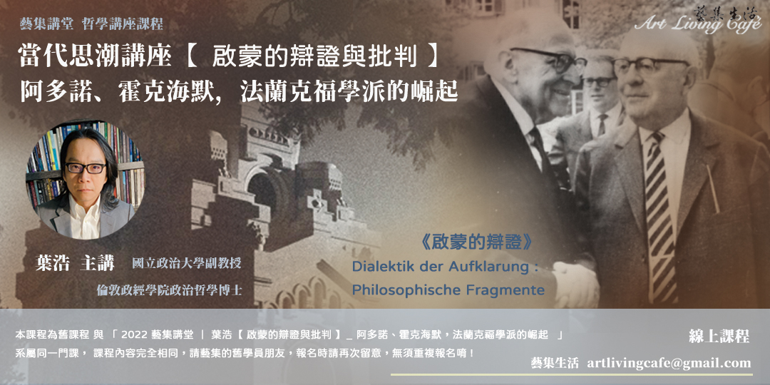 本課程為舊課程 與 「 2022 藝集講堂 | 葉浩_【 啟蒙的辯證與批判 】__ 阿多諾、霍克海默,法蘭克福學派的崛起 」系屬同一門課, 課程內容完全相同,請藝集的舊學員朋友,報名時請再次留意,無須重複報名唷 !