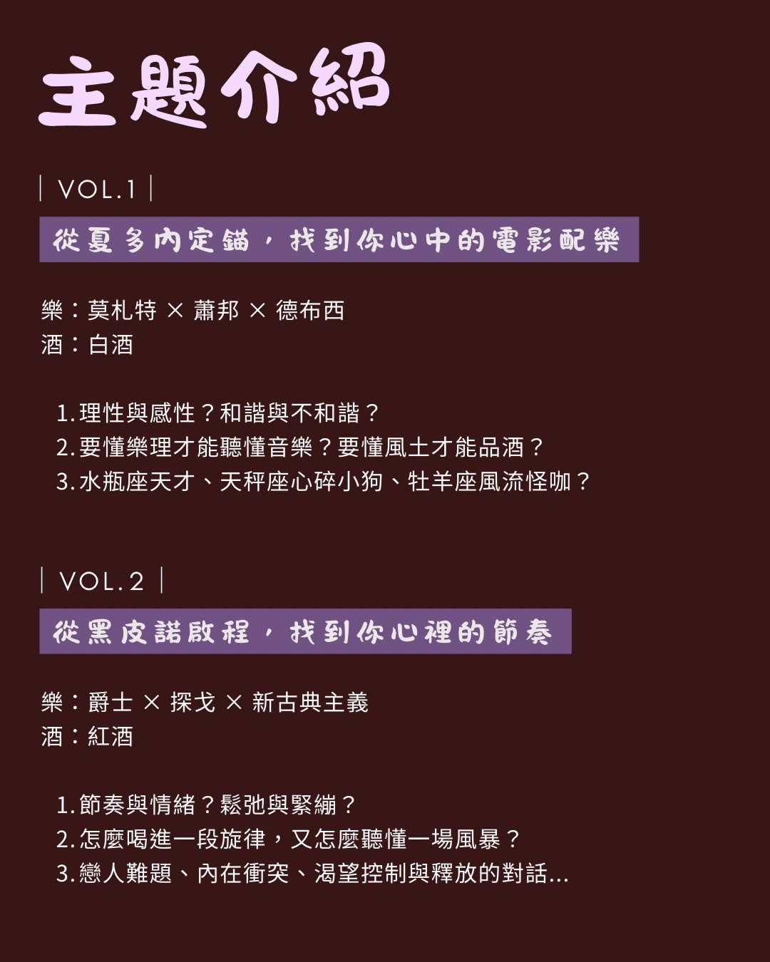 「如果每一首樂曲都有一支適合搭配的飲品,那你,會是莫札特的夏多內,還是探戈裡的馬爾貝克?」