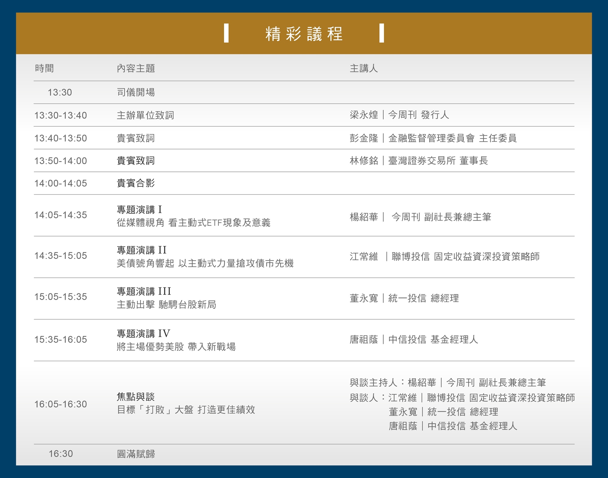 邀集邀請最懂市場的人:金管會主委彭金隆 × 證交所董事長林修銘重磅登場及金控操盤專家、資產管理高手