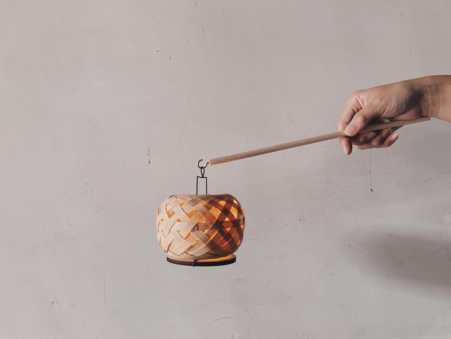 擷取傳統泉州式篾仔燈的元素「輪口編」、「壓一挑一」這兩個技法。燈座沿用傳統的方式,使用鐵絲與木底座。燈體比例縮短看起來好像台南碰餅的形狀,圓圓滿滿。