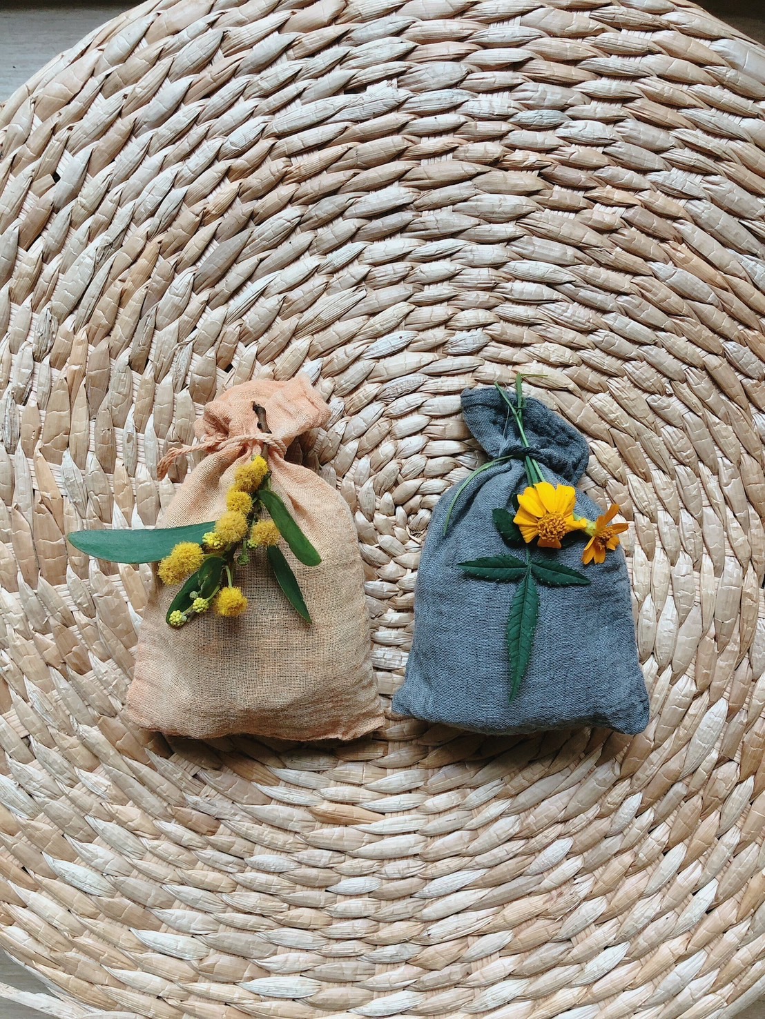 ⊹ 填充木屑與藥草、綁袋、搭配當季花草綁飾裝飾完成