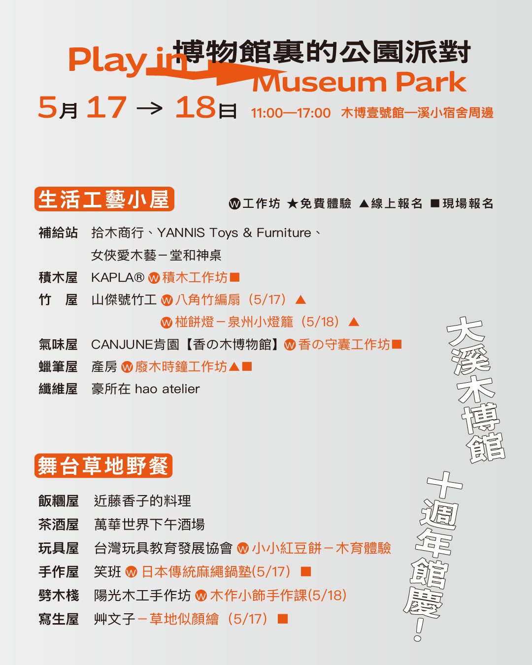 開幕週限定的慶生派對,以「PLAY in MUSEUM PARK」為題,規劃 PLAY in Woods / Crafts / Arts 三大分區,還有一系列演出和音樂放送,邀請大家一起散步城區、草地野餐,來場博物館裏的公園派對!