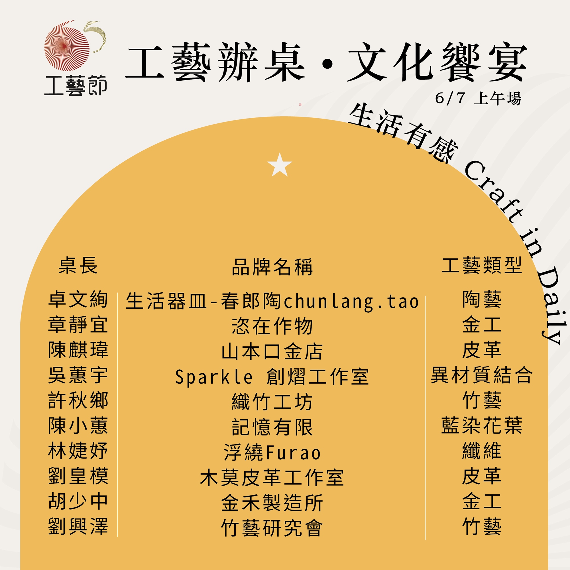 以辦桌的形式,營造工藝與大眾的親密互動場域,透過深度的觀摩與五感體驗,展現工藝手作的溫度與文化魅力。活動旨在讓工藝融入生活,並激發參與者對工藝文化的認同與欣賞,傳遞手感工藝的美好價值,實現文化與日常的深度連結,為生活帶來獨特的藝術饗宴與創意靈感。