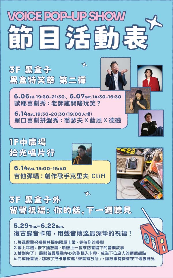 投進「聲音寄放所」的每一卷卡帶故事,有機會在6.14活動當天,由創作歌手克里夫 Cliff親自唸出,並以歌聲演繹那段觸動人心的旋律與故事,成為舞台上最真摯、最動人的時刻。