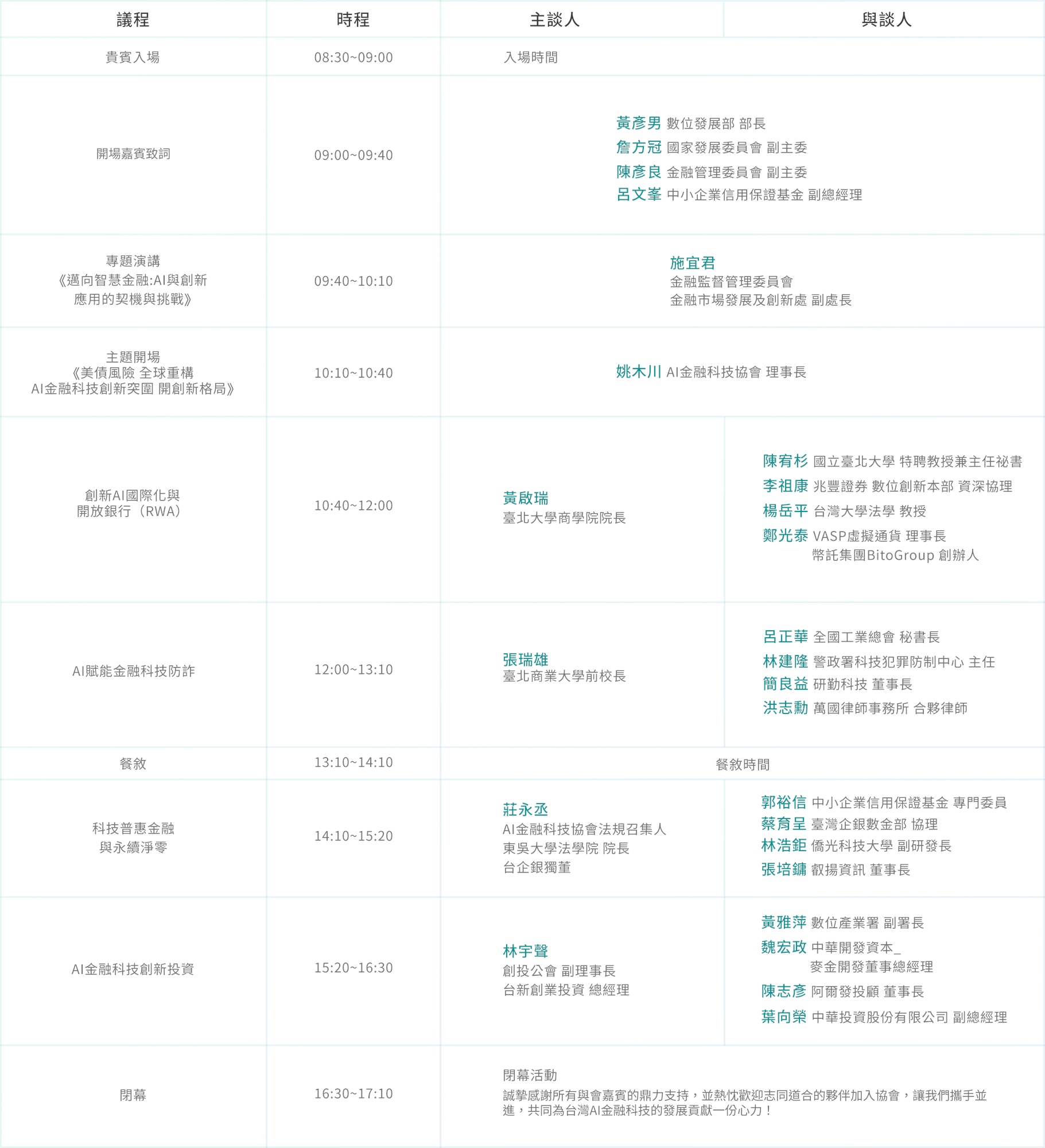 #AI金融科技 #防詐騙 #新創成長 #金融服務 #平等 #永續 #專題演講 #產學交流 #開放銀行 #普惠金融 #創新生態 #投資策略 #論壇流程 #交流時間 #台大集思會議中心 #金融科技未來