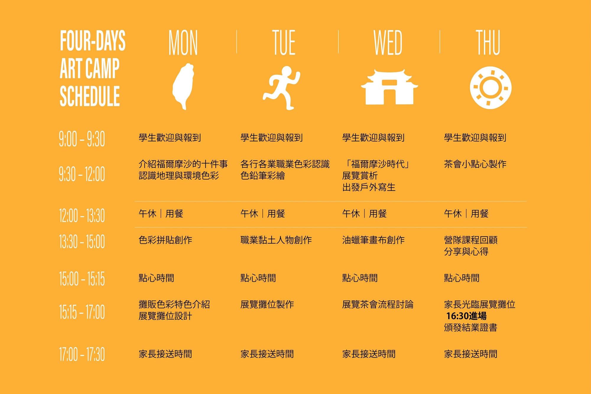 營隊的最後,將策劃一場屬於孩子們的迷你藝術展覽,每位小小藝術家都能打造專屬小攤位,分享四天的創作成果與色彩故事,與家人朋友一同分享課程所學與創意!