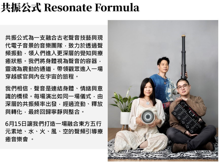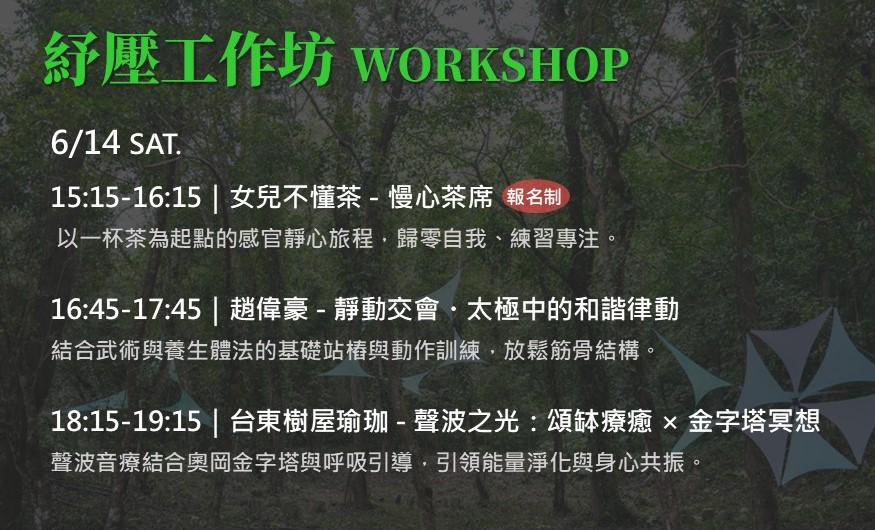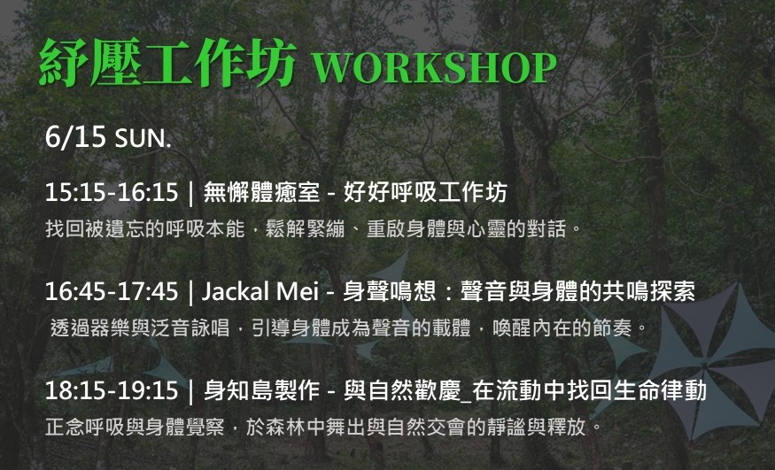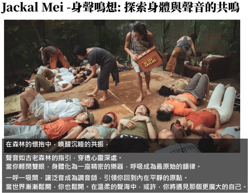 - 參與對象:喜歡嘗試各式體驗活動、身心靈探索,或想暫時跳脫繁忙生活節奏,享受片刻身心平靜的你!