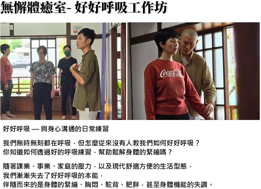 本次工作坊要用短短60分鐘的時間,帶大家找回呼吸的本能,在躺、站、坐三個姿勢下,