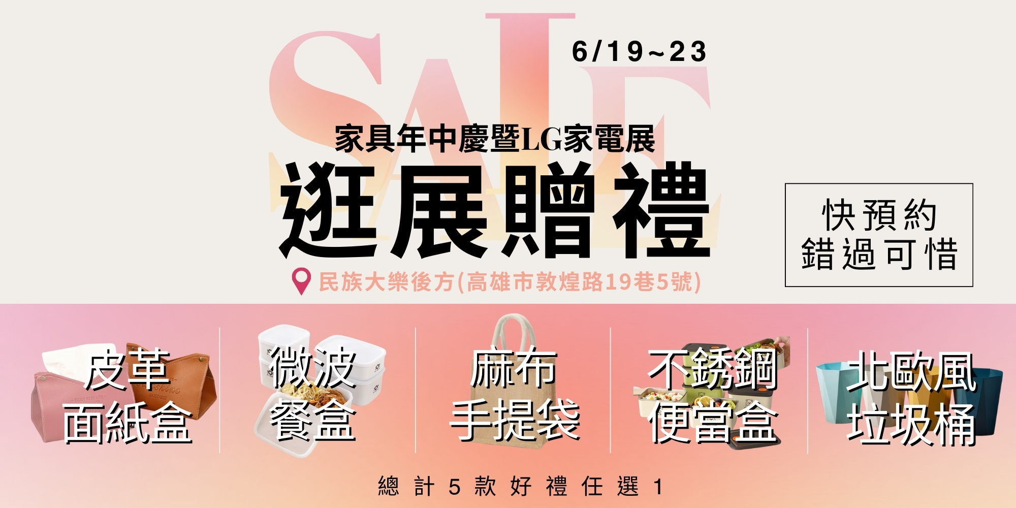 提早報名來逛2025一年一度「高雄傢俱名床訂製系統櫃年中慶大展暨LG家電新品福利品特賣會」現場再「送豪禮5選1」,特邀專業設計團隊抵達高雄場,首度展出2025年最新款沙發、茶几、床墊、系統櫃...等,保證獻給鄉親最新最優惠的活動與價格!特蒐百大流行居家風格,另外難得特別邀約「百年美國伊麗絲名床特賣會」共襄盛舉,謹訂於6/19(四)~6/23(一) 高雄市敦煌路19巷5號 (民族大樂後方)舉辦高雄年中慶大展大回饋,商品眾多絕對讓你耳目一新,歡迎蒞臨免費參觀!