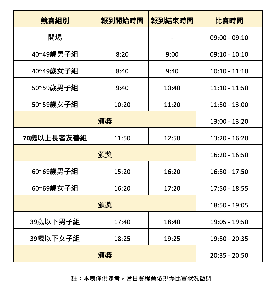 - 比賽請著寬鬆衣物與包覆腳趾的防滑鞋,可以自備毛巾和飲水。