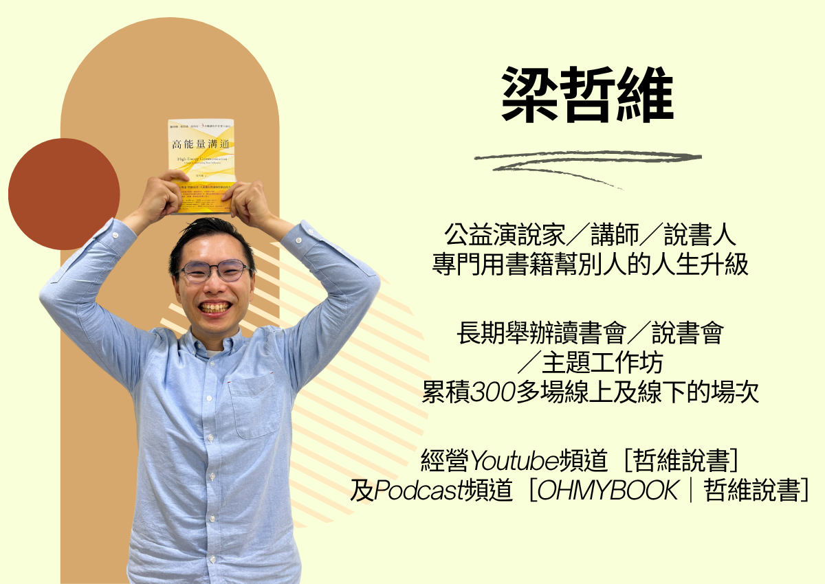 經營 YouTube 頻道【哲維說書】與 Podcast[OHMYBOOK|哲維說書],以深入淺出的風格分享書籍精華與實用觀念,持續用知識陪伴大眾邁向豐盛富足的理想生活。