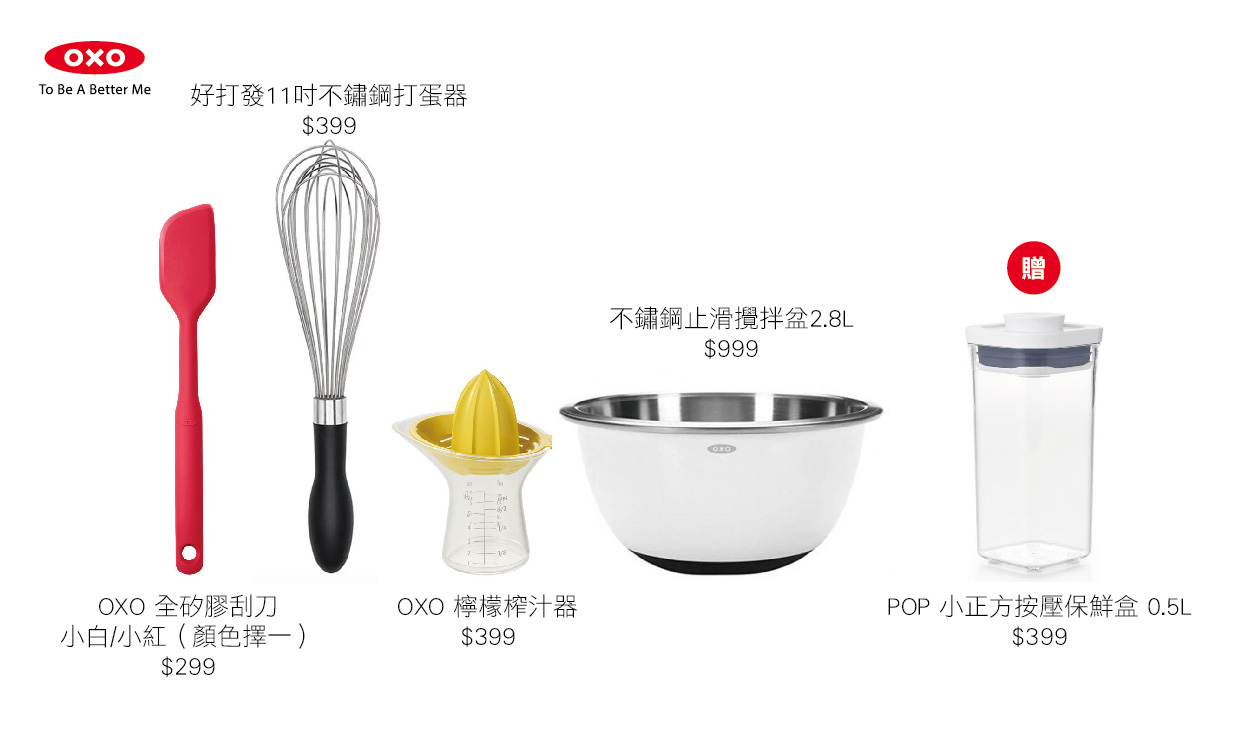 ② $2,099元。優惠價購買OXO五件組,包括「檸檬榨汁器 x1、不鏽鋼止滑攪拌盆 2.8L x1、好打發11吋不鏽鋼打蛋器 x1、小全矽膠刮刀 x1、POP 小正方按壓保鮮盒 0.5L x1」,且含參加活動。