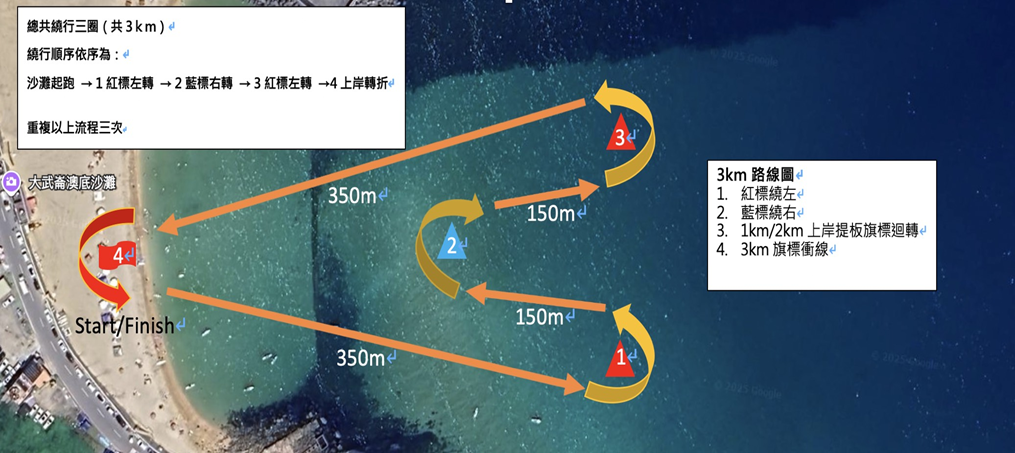 - 需沙灘起跑方式出發,需繞過標的外側才算通過,如無按照官方指示繞標成績無效。