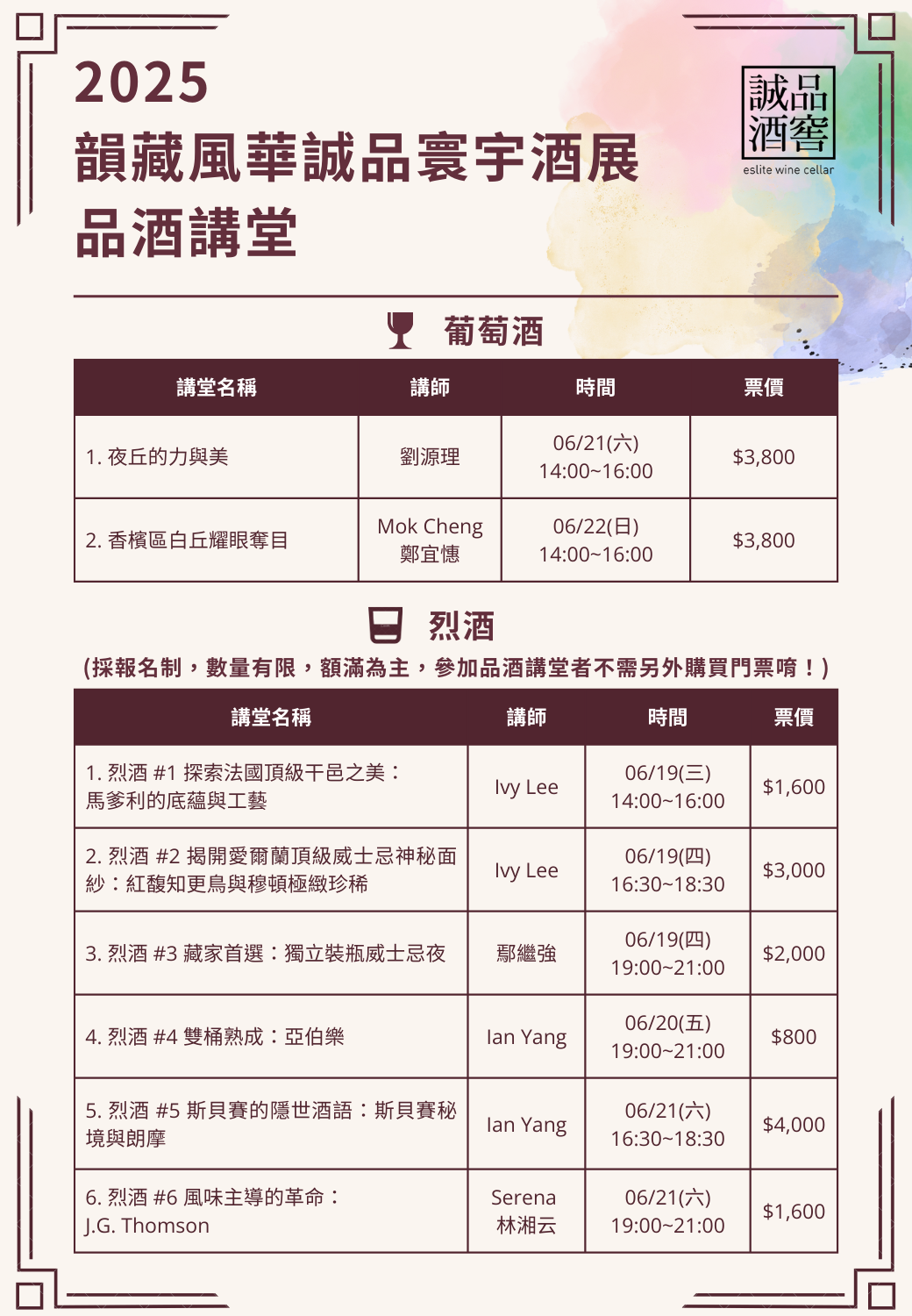 - 活動期間,舉辦【品酒講堂】共 8 堂課程,須額外報名,購買講堂者,當日可免費入場,數量有限,額滿截止。