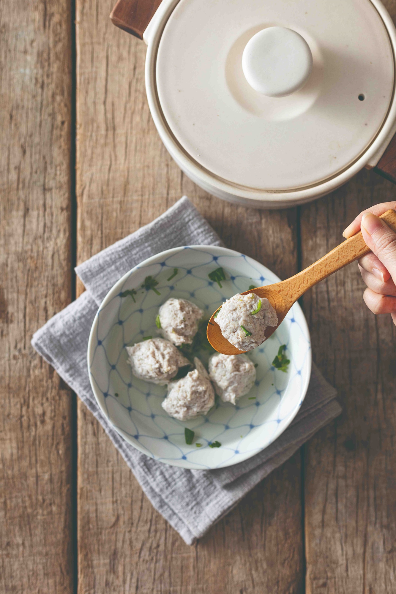 整條去骨去刺的虱目魚與山藥、蓮子、芡實和茯苓四味食療藥材做成手工魚丸,味道甘淡溫和,煮出一碗簡單清爽的四神魚丸湯。