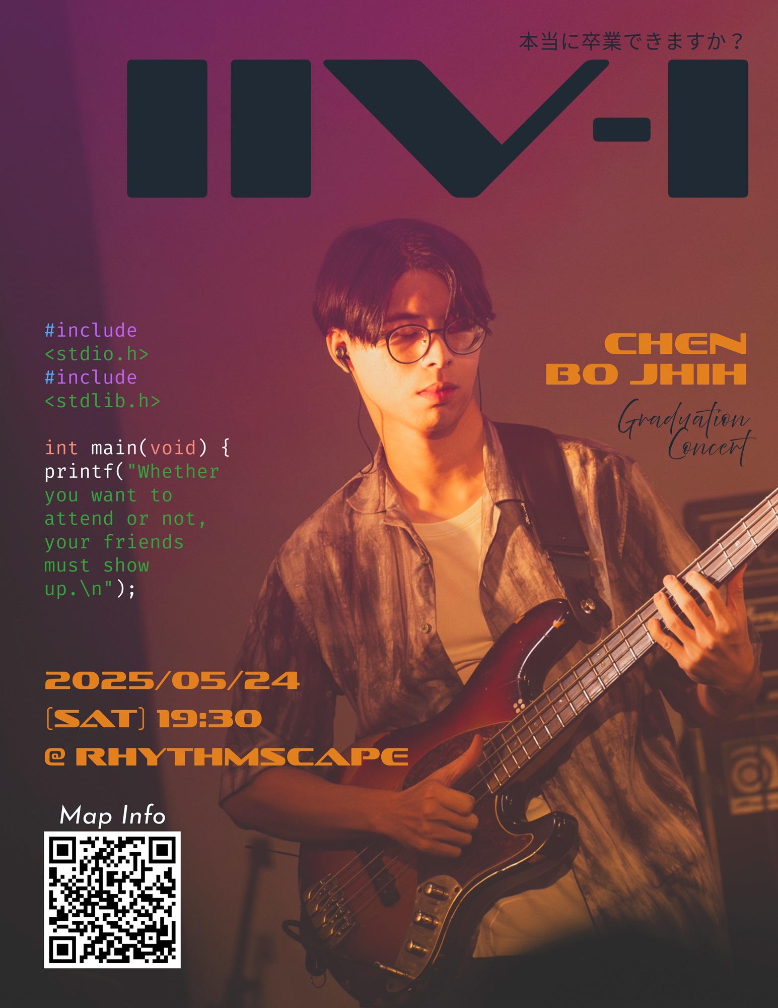 本場畢業音樂會以「二五」為題,站在25歲與代表爵士樂的IIV交匯點,交織這10年的成長與軌跡。當天會帶來一些與我有關或我喜愛的爵士曲目們與自創曲,也會分享一些我與音樂的故事與想法,期許能帶給大家一些不錯的能量與想法。