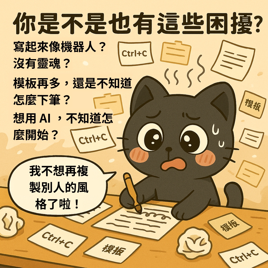 - 被大量模板淹沒:市面上充斥各種 ChatGPT 指令包,卻無法真正解決「我該怎麼寫出屬於自己的文案」的核心問題。