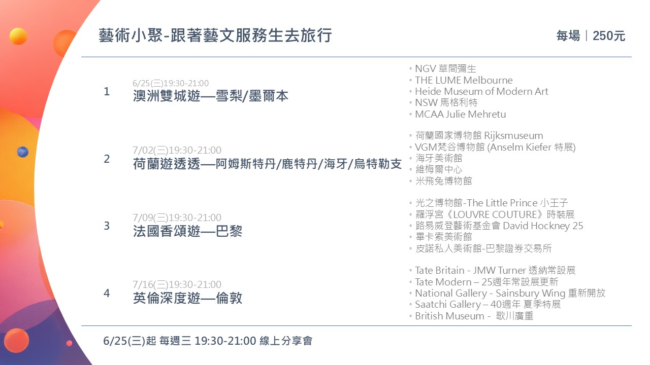 為了充實的教學案例,藝文服務生於今年實地走訪了澳洲、荷蘭、法國、英國各地,參訪各地美術館、畫廊與相關藝文場域,如從倫敦Tate Modern到墨爾本NGV、巴黎羅浮宮到阿姆斯特丹梵谷博物館,藝術家涵蓋當代藝術草間彌生和David Hockney、經典大師透納、維梅爾、馬格利特等,如果只納入《2025藝文寫作班》專業教學內容就太可惜了,所以特別舉辦《藝術小聚》,用更輕鬆詼諧的口吻,以及搭配各地好吃好玩的景點,帶領大家來一場沉浸式文化藝遊,一起培養觀展力!