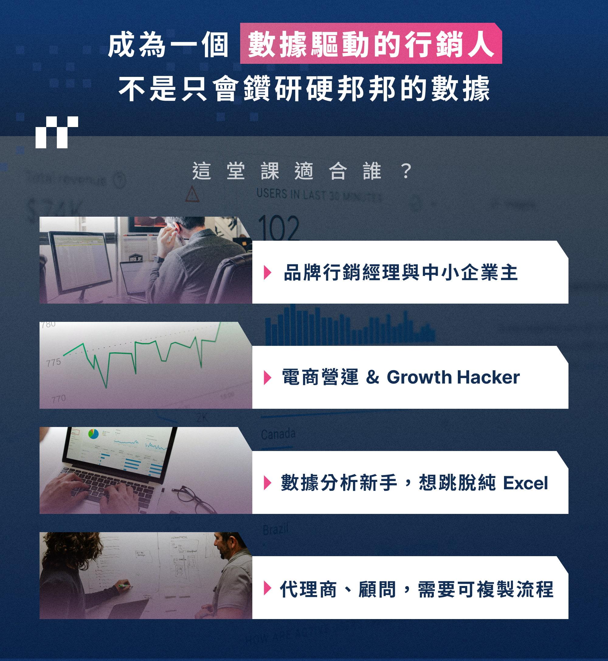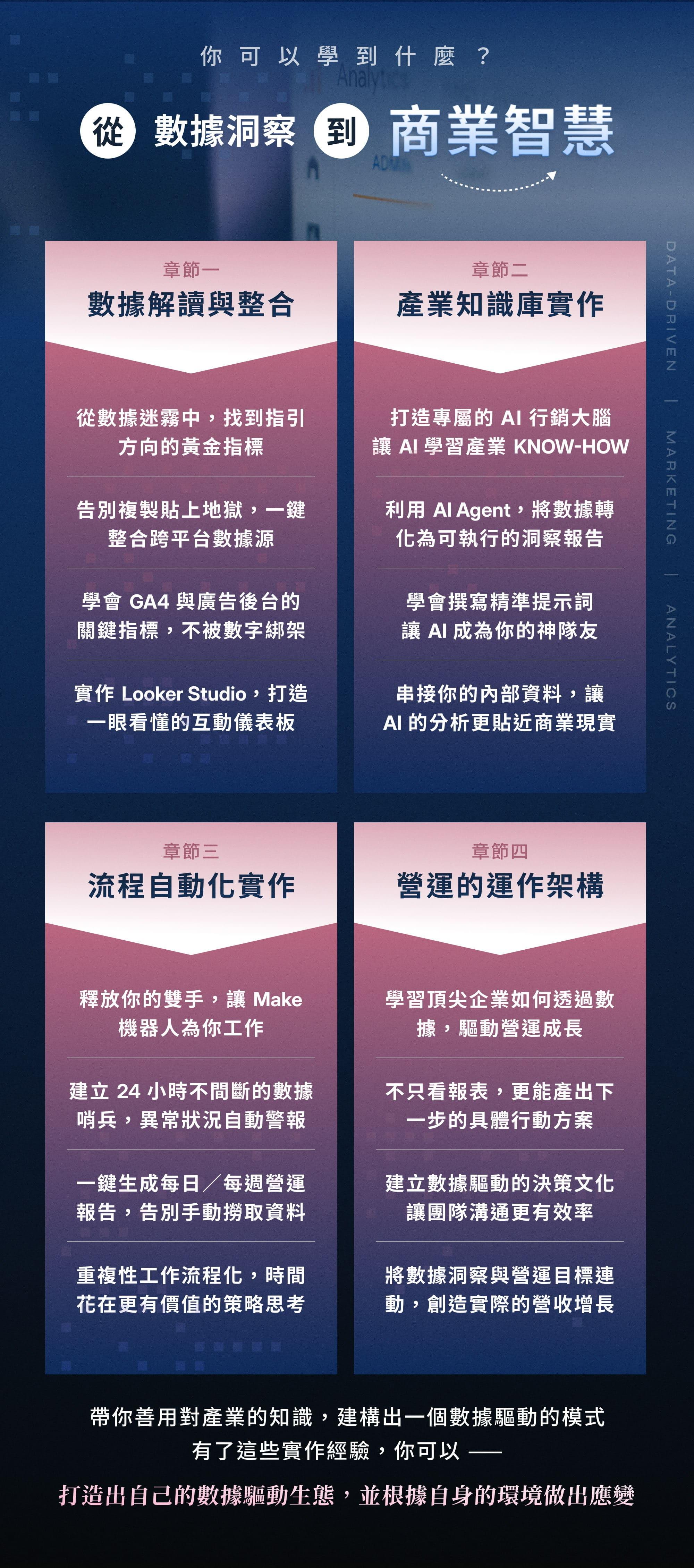 當然可以!課程提供示範帳戶、 教學用 GA4 與電商訂單範例,讓你邊學邊練習。 後續若需導入自身資料,也能把同樣流程直接複製貼上。