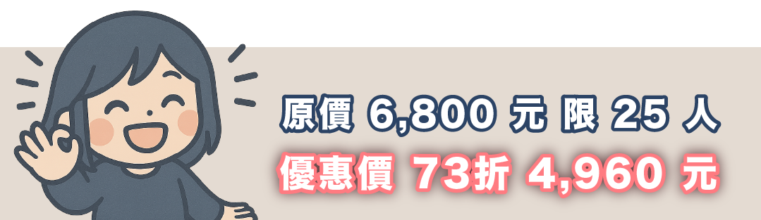 6,800 NT$早鳥價:4,960元(73折) - 名額限制:台北班限額 25 人,小班實作,確保每位學員產出完整作品
