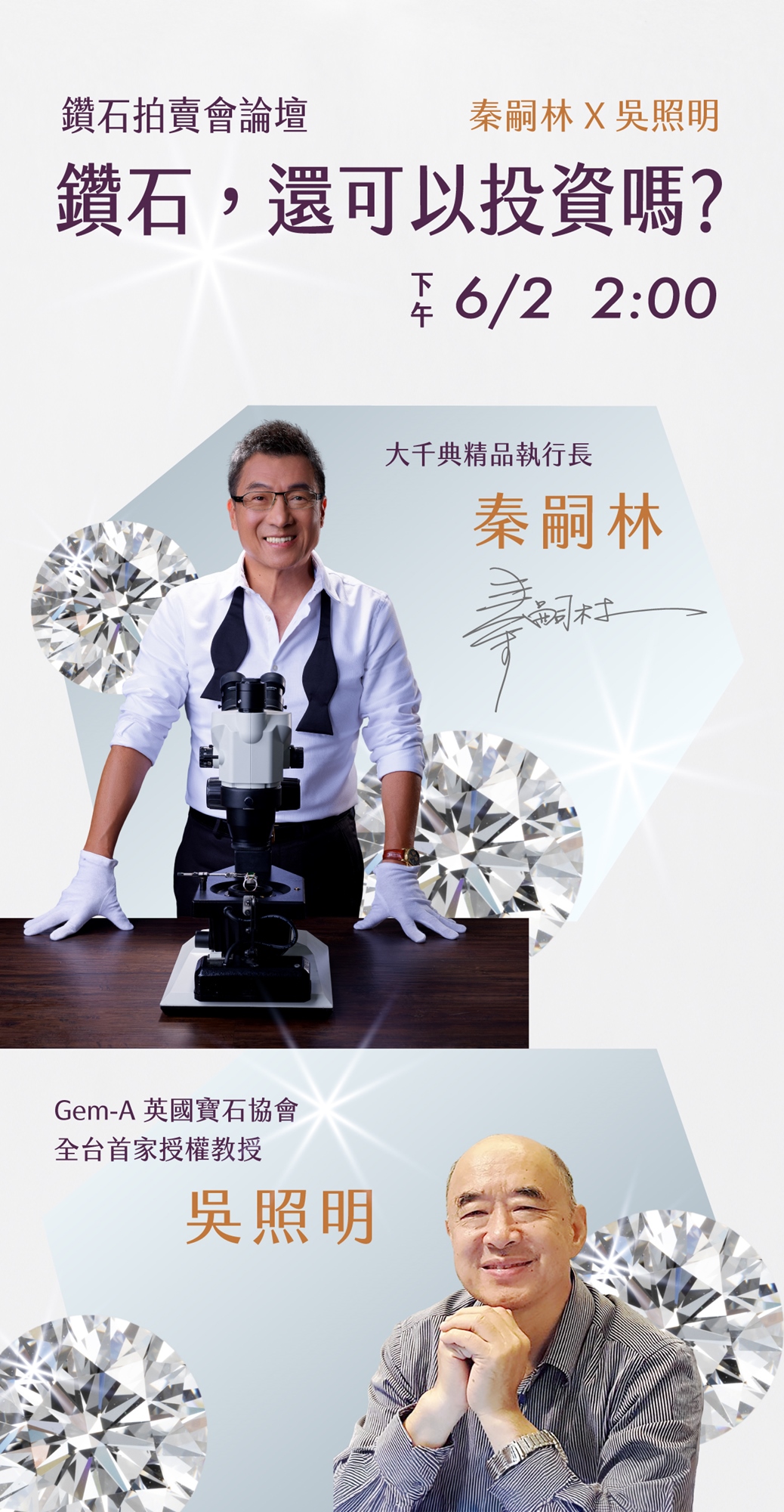 本次鑽石拍賣會由資深寶石專家秦老闆策劃,帶領大千典精品專業鑑定團隊認證高品質天然鑽石,所有拍品皆以極具吸引力的起標價公開競標,讓您有機會用遠低於市價的價格,輕鬆入手真鑽逸品。無論您是首次購買鑽石或是資深收藏者,這場拍賣會將是尋找價值與美感兼具寶石的絕佳機會。誠摯邀請您蒞臨參與,親自體驗智慧選鑽、划算入手的獨特魅力。