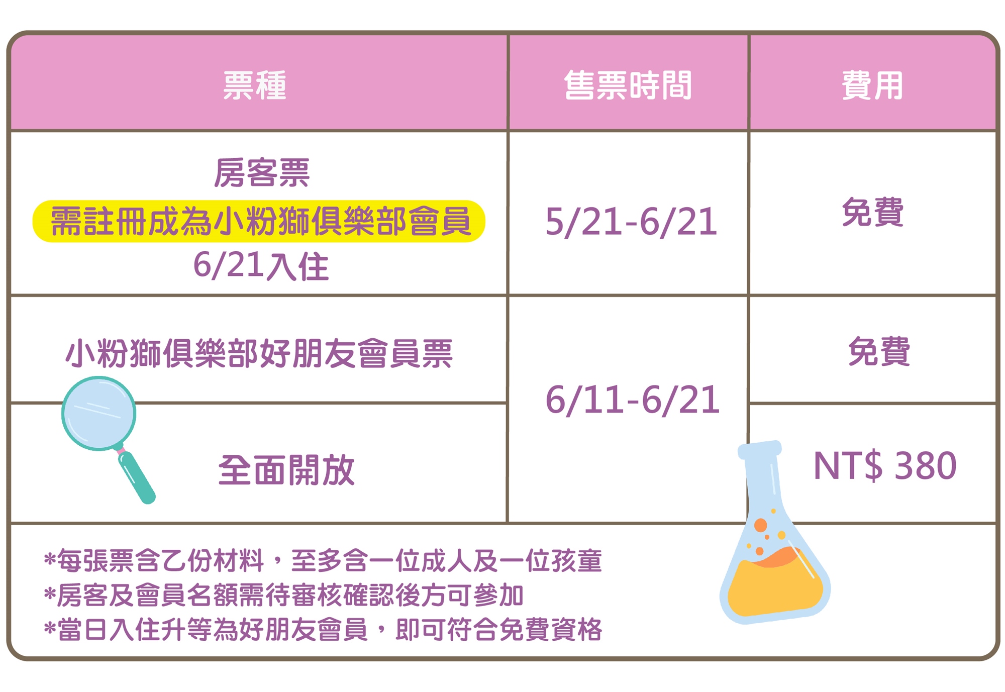 ●注意事項:每房最多兩組免費名額,如超過需另行購買一般票