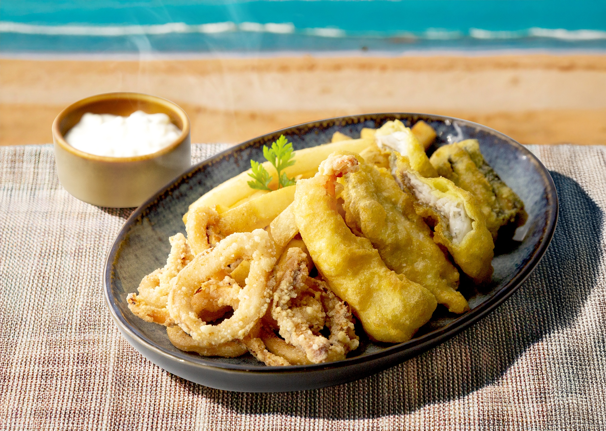 餐點內含:個人海鮮炸物拼盤-嚴選酥脆透抽、鮮嫩鱸魚、酥炸嫩薯、飽滿鮮甜根島蝦