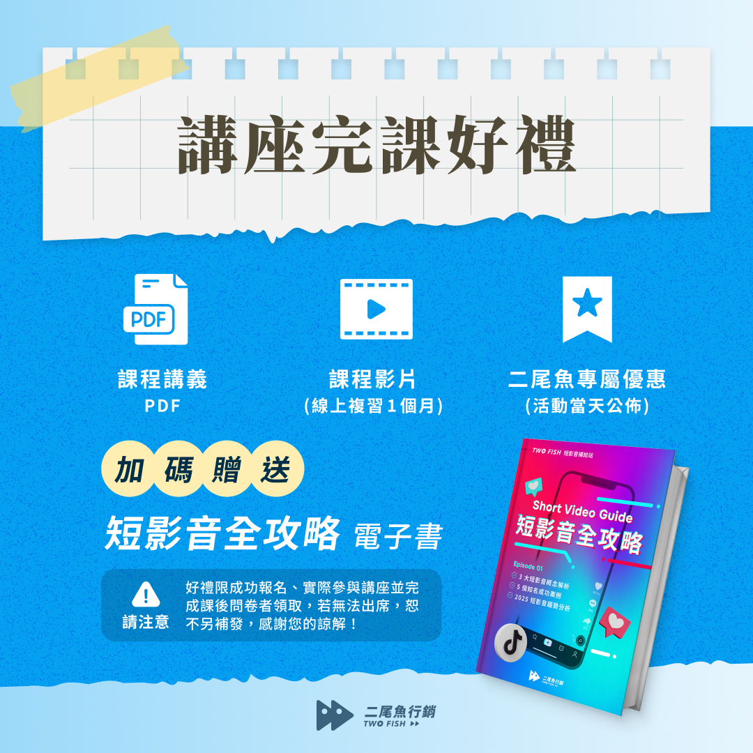 - 加碼贈送:二尾魚《短影音全攻略》電子書 1 本