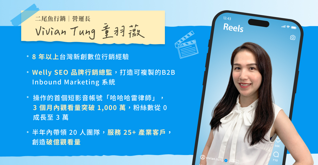 - 曾任 Welly SEO 品牌行銷總監,打造可複製的 B2B Inbound Marketing 系統。