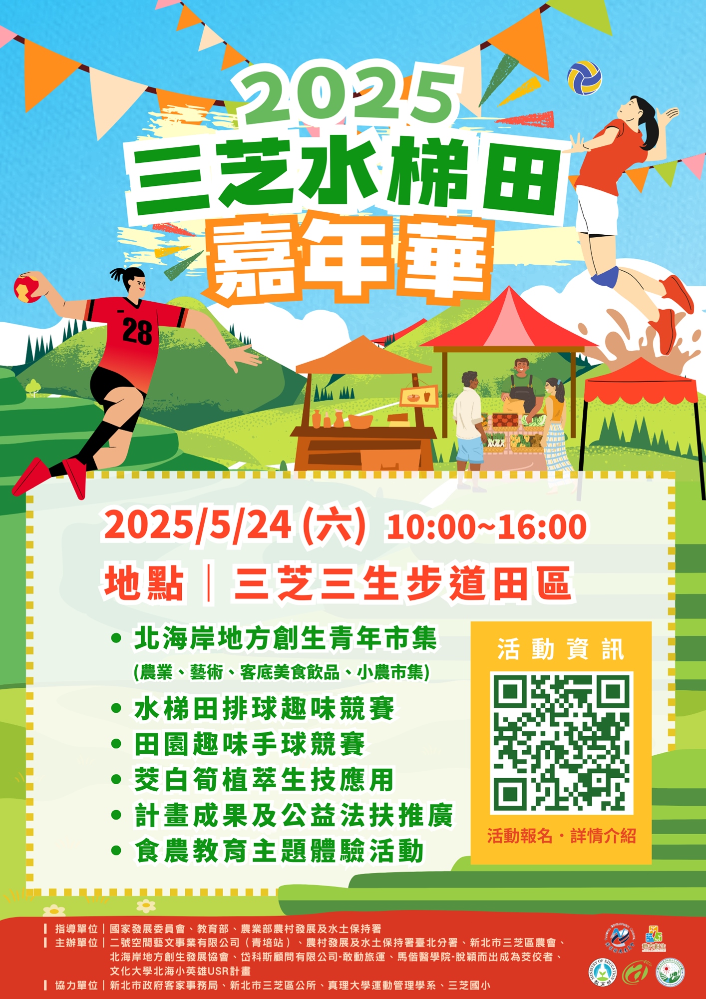 5/24 當天現場還有精彩的市集可以逛、水梯田排球與田園手球比賽可以觀賽,主舞台也安排了豐富的表演節目等你來共賞!