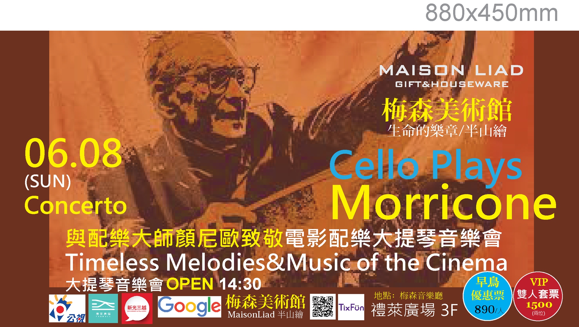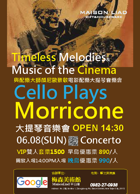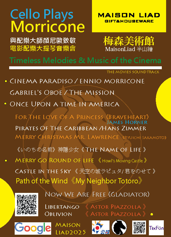2025音樂會紀念MORRICONE 在我們心中重要的所留下的重要生命樂章,MAISON LIAD梅森美術館,特別邀請旅行義大利佛羅倫斯管樂團大提琴手C.C 與你重新一起聆聽美麗動人的樂章.