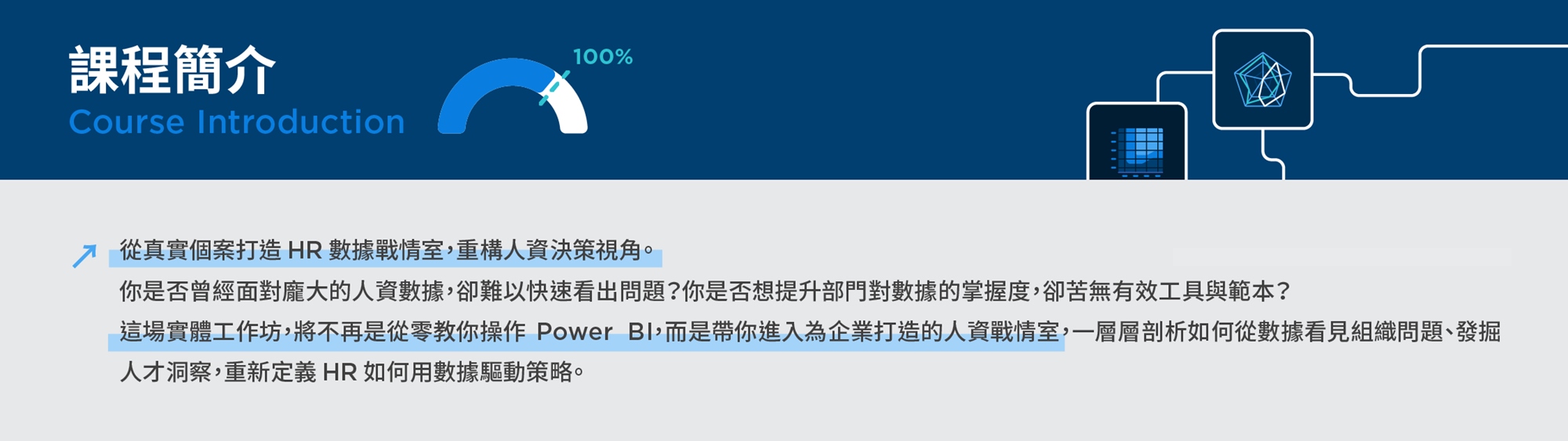 實戰打造的 Power BI 戰情室範本,逐步解析「員額規劃」、「出勤趨勢」、「招募成效」、「異動風險」等議題。