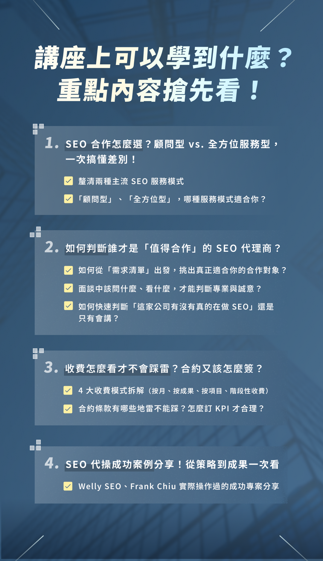 本場活動我們邀請到 白話文商學院 Frank Chiu 來與我們聊聊怎麼選 SEO 公司!