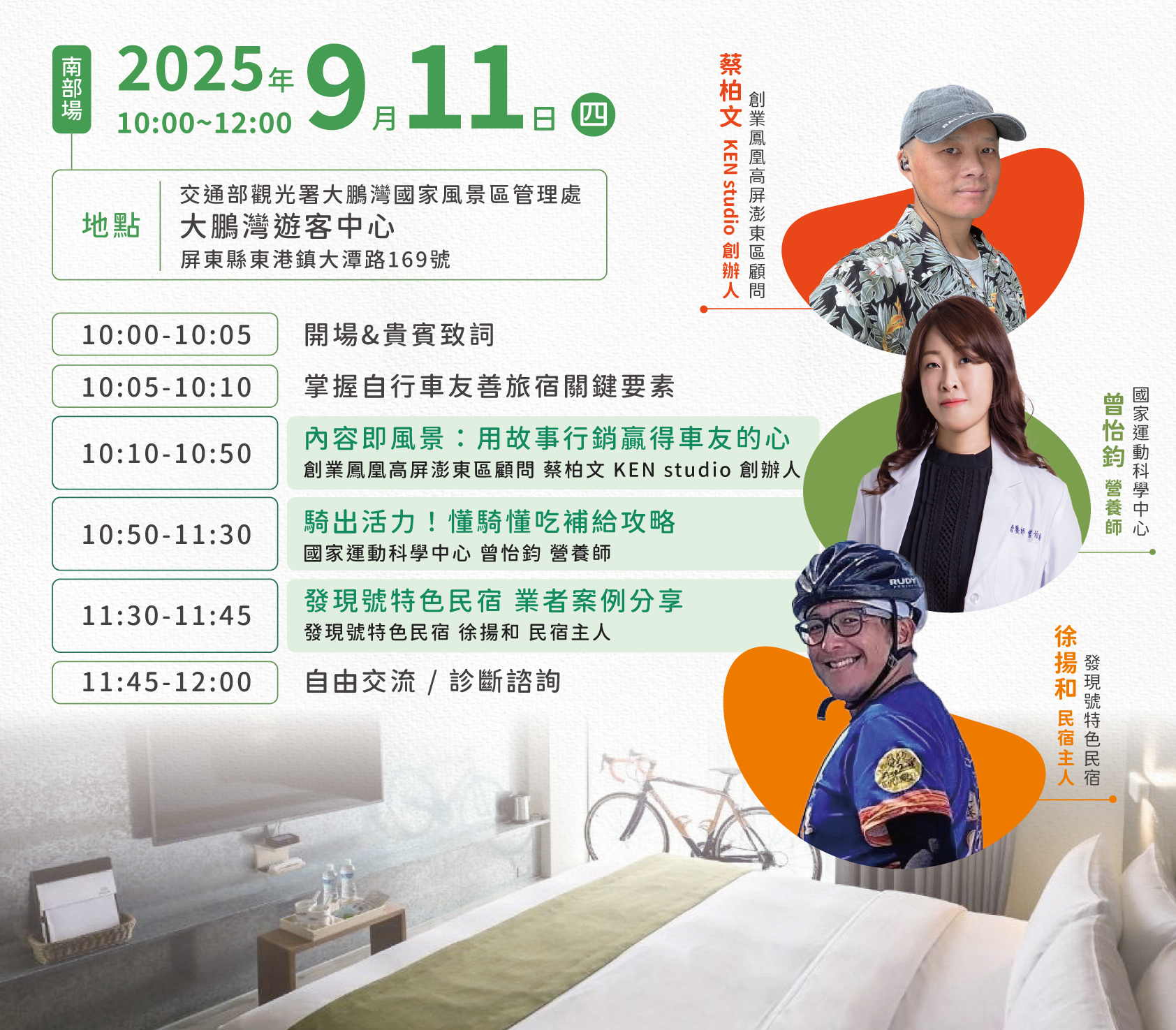 我們特別邀請具實務經驗的業者,親身分享從最初「無法招架」到後來「懂騎懂住」的成長歷程,並安排實地參訪自行車友善旅宿場域,讓你親眼見證空間如何規劃、服務如何升級。
