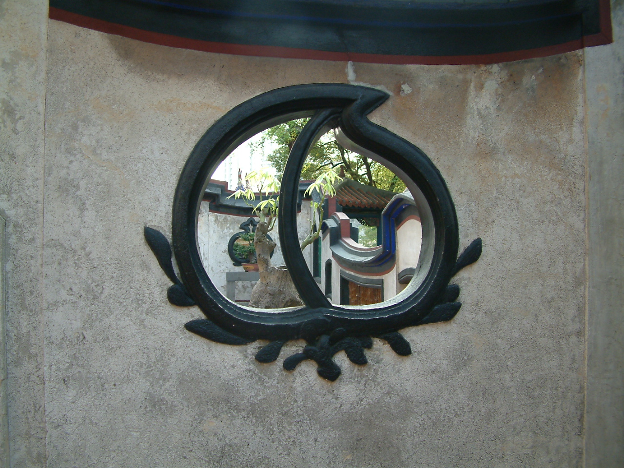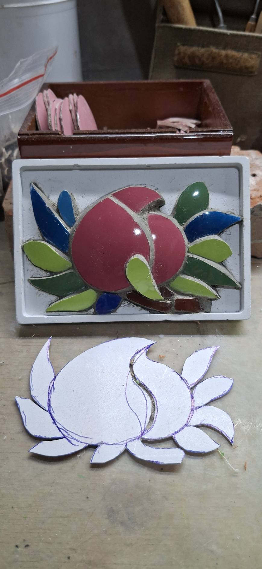 說明:製作壽桃圖案之剪黏作品,藉由林園漏窗圖案,可讓學員瞭解傳統剪黏碗片剪裁、貼黏製作手法。