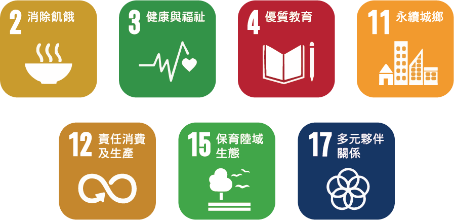 SDG 2(消除飢餓):推廣在地青農友善耕作與季節性食材,利用當日現採食材製作餐點,推動從產地到餐桌的減碳飲食,落實永續食物系統。