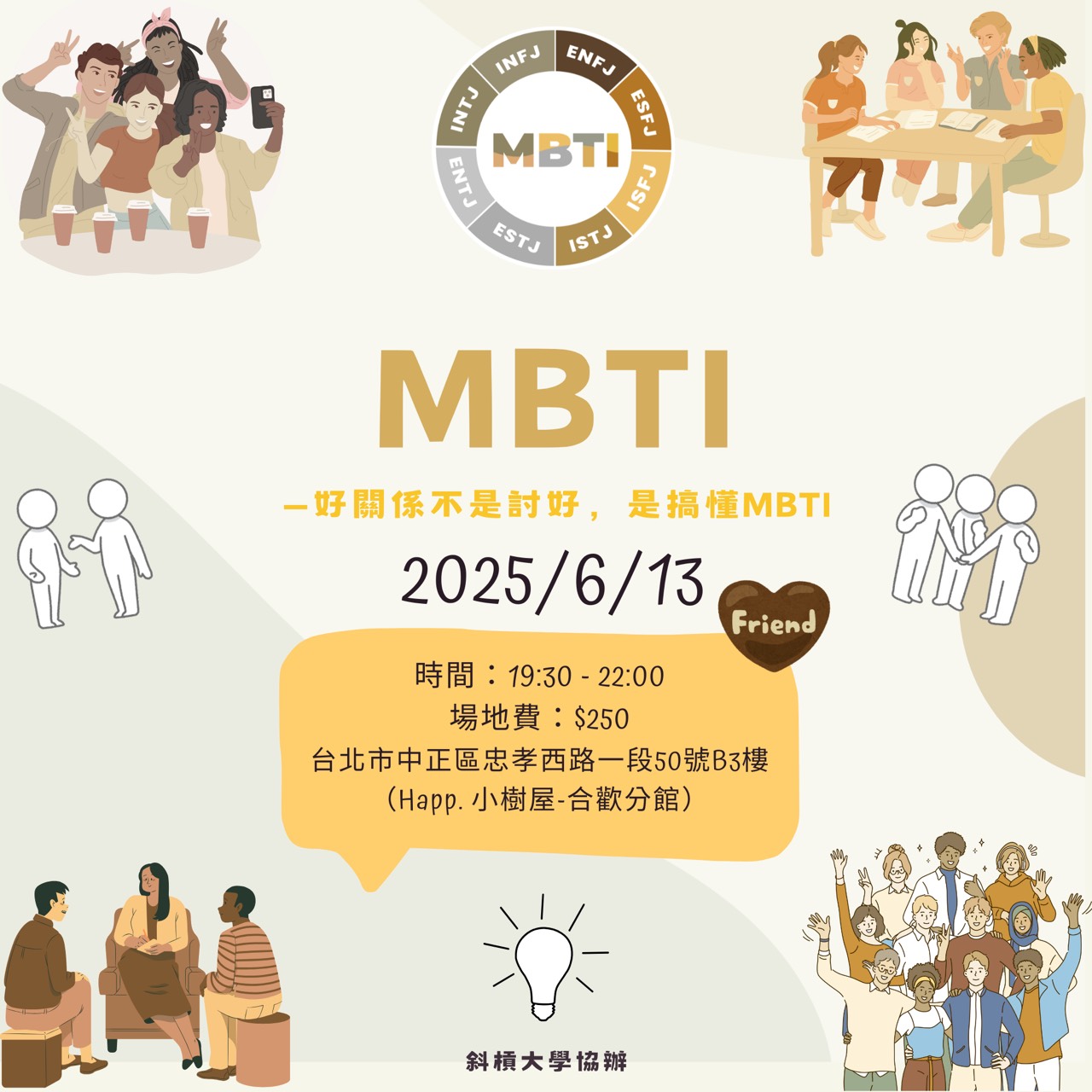 肯洽那~透過MBTI,分組互動、輕鬆聊天的方式,你會遇見和你互補、共鳴、甚至可能改變你人生方向的朋友喔~