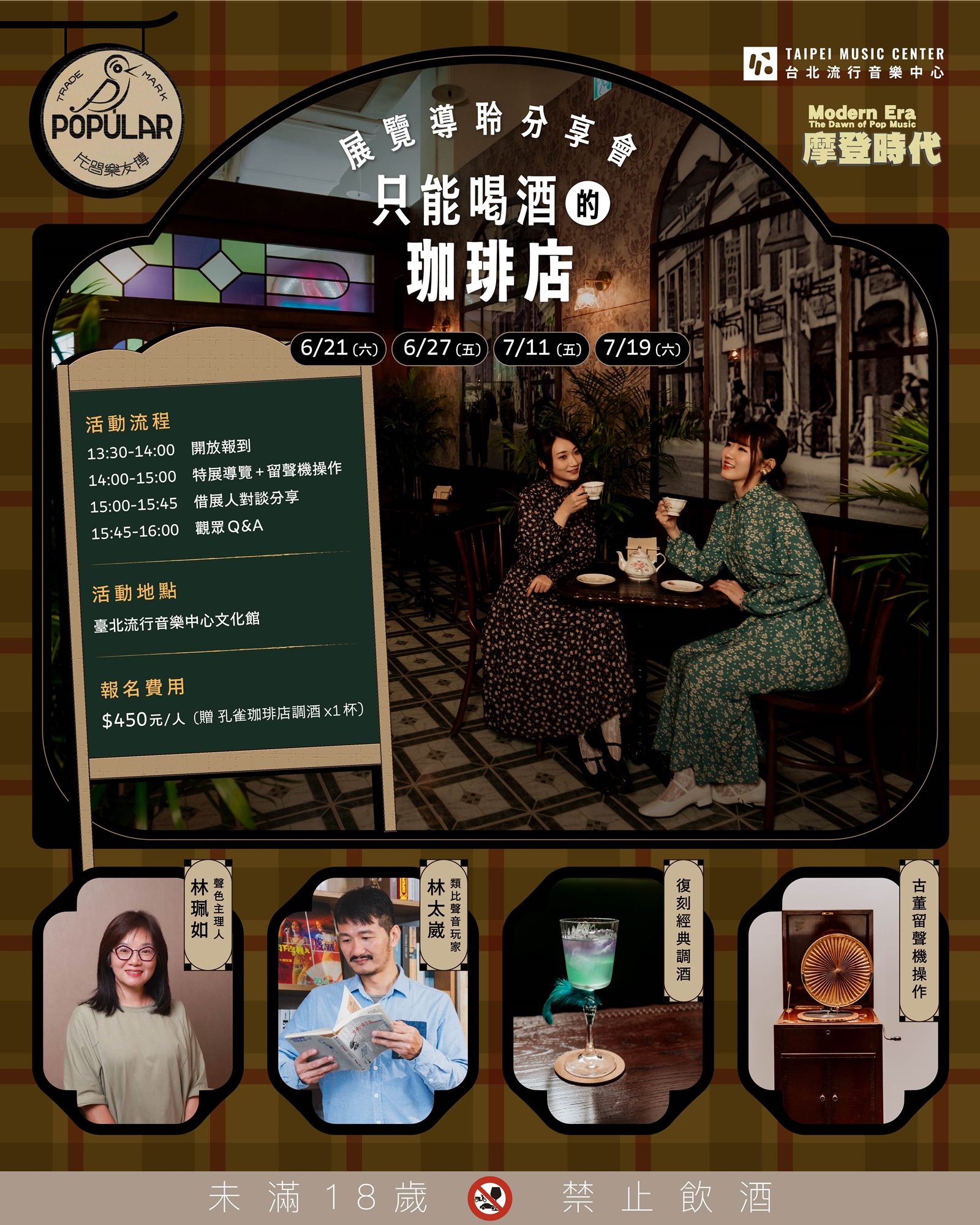《摩登時代:唱片轉動.流行誕生》展覽,特邀兩位靈魂借展人「聲色主理人」林珮如小姐及「類比聲音玩家」林太崴先生擔任各位的辯士,以視覺、聽覺佐美酒,啟動古董留聲機,回到彼時博有樂唱片及孔雀珈琲店的摩登時代。