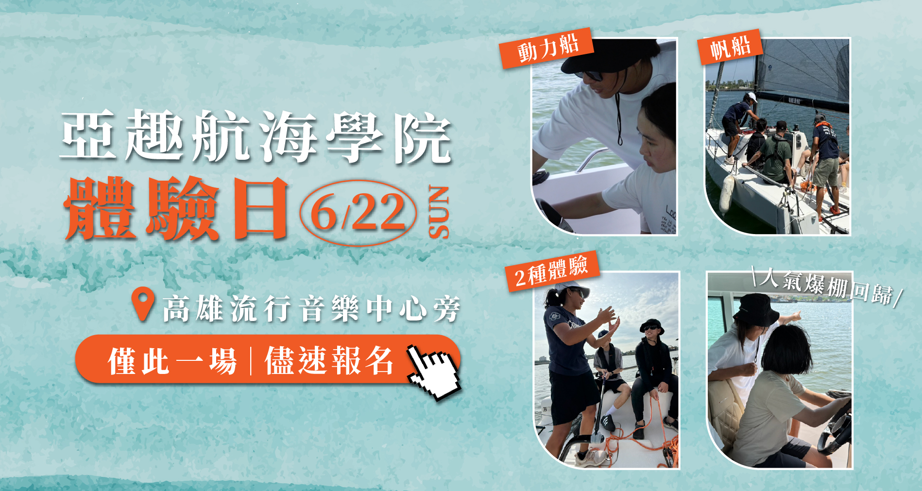 「亞趣航海學院體驗日」,本次活動採帆船+動力船雙體驗,各時段名額有限,請儘速報名!