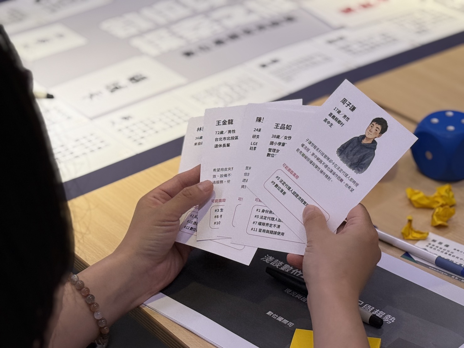 以「類桌遊形式」的活動當中,參與者將透過真實生活角色的扮演,如代管兒童身分的家長、未成年消費者、對科技不熟悉的長者等,透過模擬場景深入討論各類議題,如: