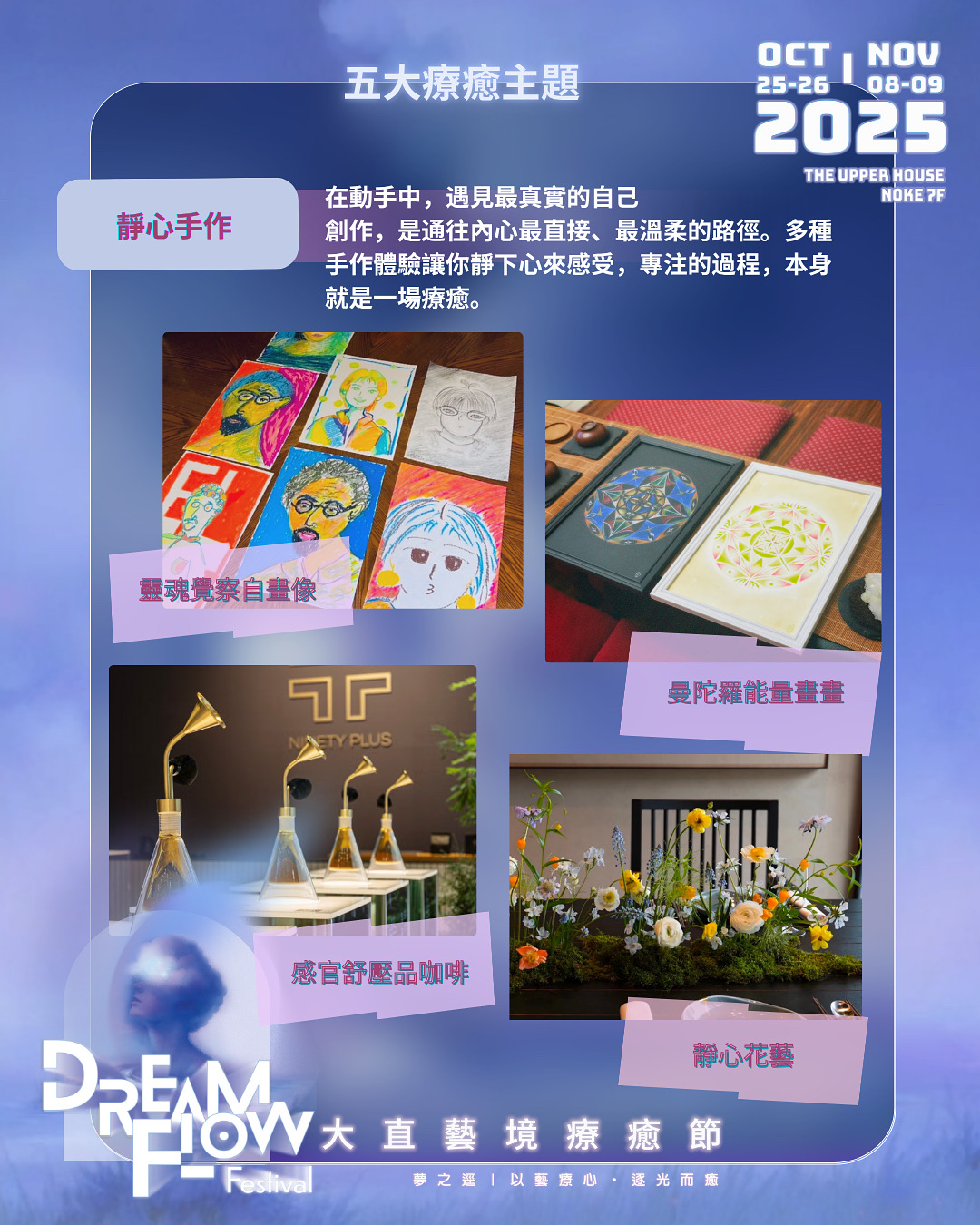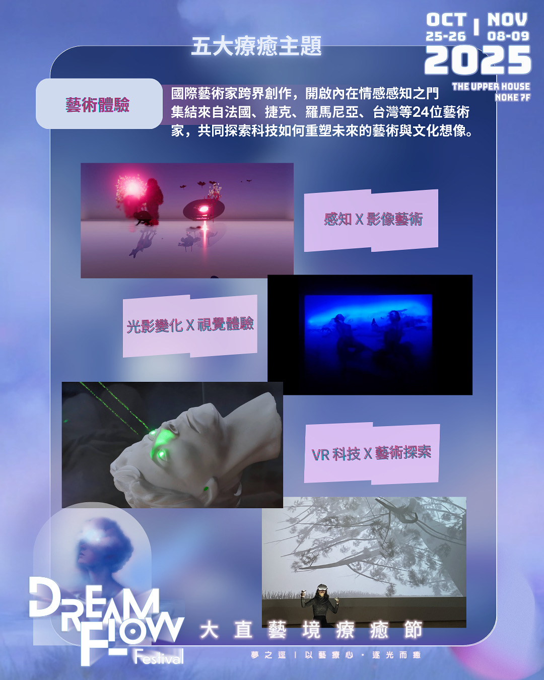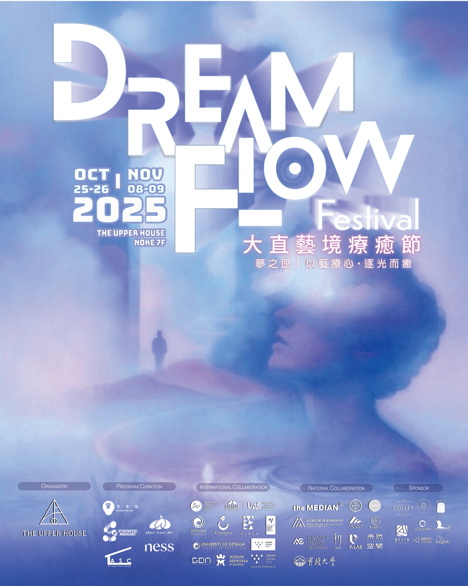 The Upper House 上逸會主辦,聯合NOKE忠泰樂生活館、星本善|STARFUSION 、Wave.Heal.Art 微幅設計、SYNTHETIC MEDIART、ART SHELTER & CINEMA 及身心靈健康平台 ness wellness,共同策劃的重磅活動【Dream Flow Festival 大直藝境療癒節】,是場集結國際先鋒AI藝術、聲音療癒、身心靈探索與手作體驗,以療癒為題的全新跨界饗宴,將於10/25~26、11/08~09 共計四天於台北大直NOKE忠泰樂生活館七樓 The Upper House 上逸會首次登場!