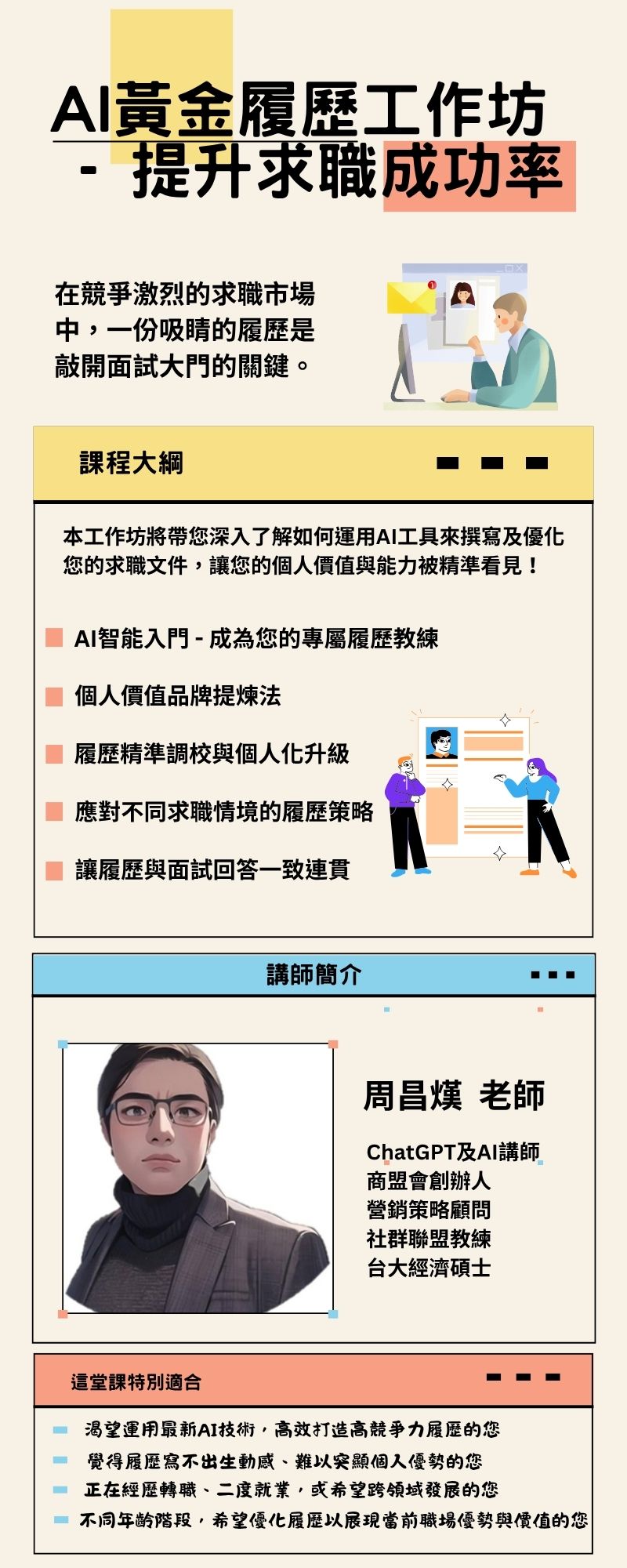 🔷一套高效運用AI撰寫與優化履歷的實用技能。