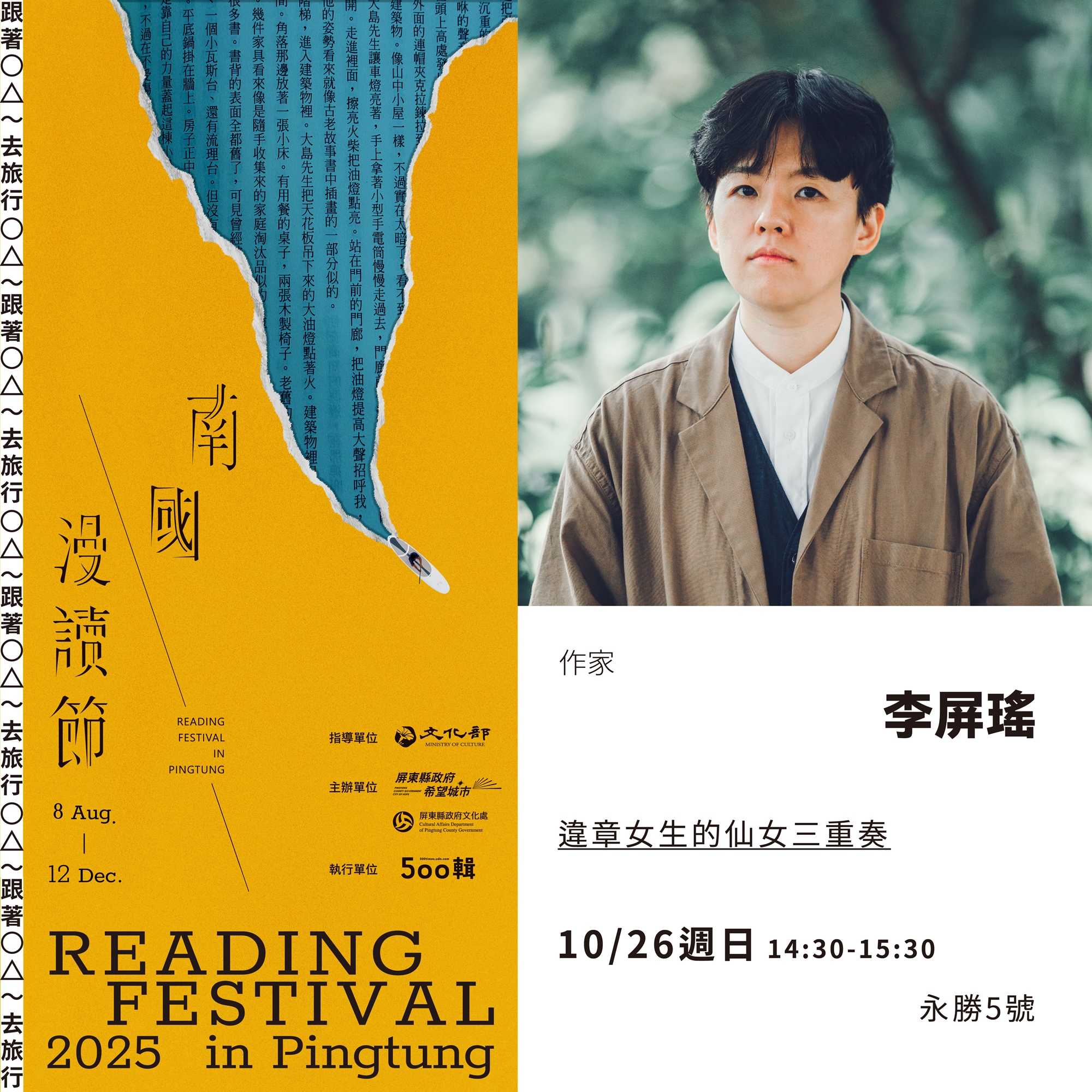 李屏瑤的創作橫跨小說、散文與劇本等多種文類,並主持 Podcast 節目。她以「違章女生」的稱號,成為當代「非典型女生」的代表人物。近年擔任兩廳院駐館藝術家期間,融合多年醞釀的靈感與紮實的田野調查,創作出劇本《仙女三重奏》,要「為台灣女鬼說故事」,並勾勒母女三代間錯綜複雜的情感與連結,預計將於 2026 年正式登場。這次來到屏東,李屏瑤將分享《仙女三重奏》的創作契機與核心概念,並談談如何透過舞台,呈現一段獨特且深刻的女系家族敘事。