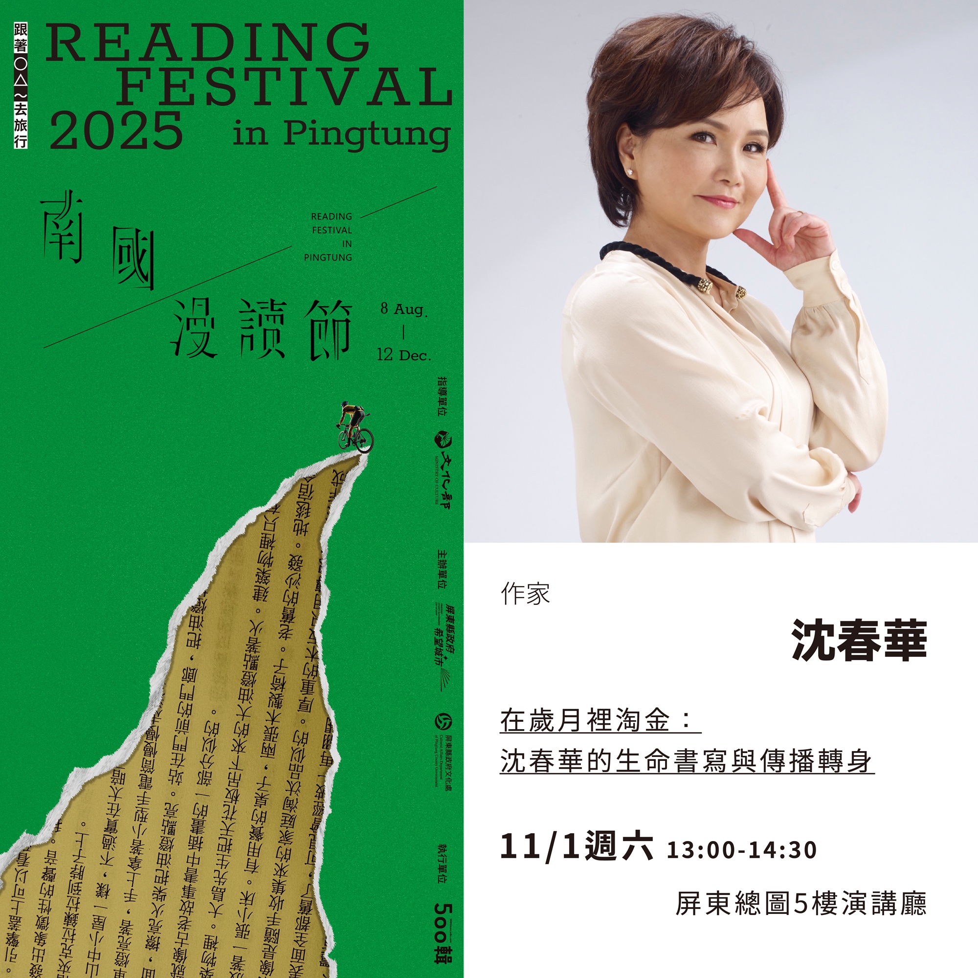 沈春華將分享其從新聞主播轉型為作家的心路歷程,探討在數位時代下,媒體人如何重新定位自我,並透過文字記錄生命的點滴。她將談及新書《在歲月裡淘金,一閃一閃亮晶晶》的創作背景,分享書中關於人生轉折、家庭關係與自我成長的故事,並與觀眾交流如何在變動的時代中,找到屬於自己的光芒。